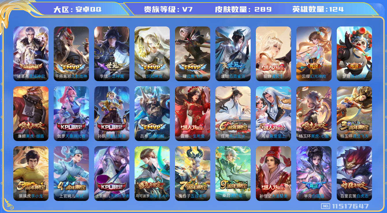 [11517647]V7 1典藏 12传说 124英雄 289皮肤 可修改实名 女号 优质装备:星域神启(倪克斯贼亮),云鹰飞将(小将军),久胜战神,炽阳神光,一念神魔,云霓雀翎,胖达荣荣 传说皮:貂蝉曦玄引,幻光神枪 珍宝阁皮:妄想食味,蔷薇恋人,女武神 限定皮:鸣野蒿,白虎志(电光耗子),白晶晶,神威(电光马子),飞衡(韩信年限),山海·碧波行(瑶年限),遇见飞天,高山流水,怒海麟威,五谷丰年,冰锋战神,天狼运算者,梁祝,天狼溯光者,天狼绘梦者,李小龙,朱雀志(守约年限),真爱至上,一生所爱,大圣娶亲,寅虎·御盾(廉颇年限),寅虎·心曲(虎婆),时之祈愿-瑶(瑶传限),山海·玄木吟(马可年限) 史诗皮:遇见神鹿,紫霞仙子,电玩小子(小书包),黄金分割率,特工魅影,电玩·爆裂旋风,江河有灵,雪夜绮愿(周瑜),蒙恬荣光圣徽,偶像歌手,魅语,无限星赏官,晚萤,猫狗日记-孙策,猫狗日记-大乔,节奏热浪,修罗,女仆咖啡,水果甜心,星夜王子,心灵骇客,时之奇旅-安琪拉,功夫厨神,德古拉伯爵,暗隐猎兽者,幽灵船长,鬼剑武藏,暗渊魔法,心灵战警,地狱岩魂,诗语江南,纤云弄巧,繁星吟游(呼啦呼啦),拒霜思,缤纷独角兽,乘风破浪,逐浪之夏,月团寄思,水晶猎龙者,曙光守护者,箭羽风息,金属风暴,原初追逐者,圣诞狂欢,圣诞恋歌,鹰眼统帅,王者之锤,魅力维加斯,黎明之约,寅虎·御盾,无心,未来纪元-赵云