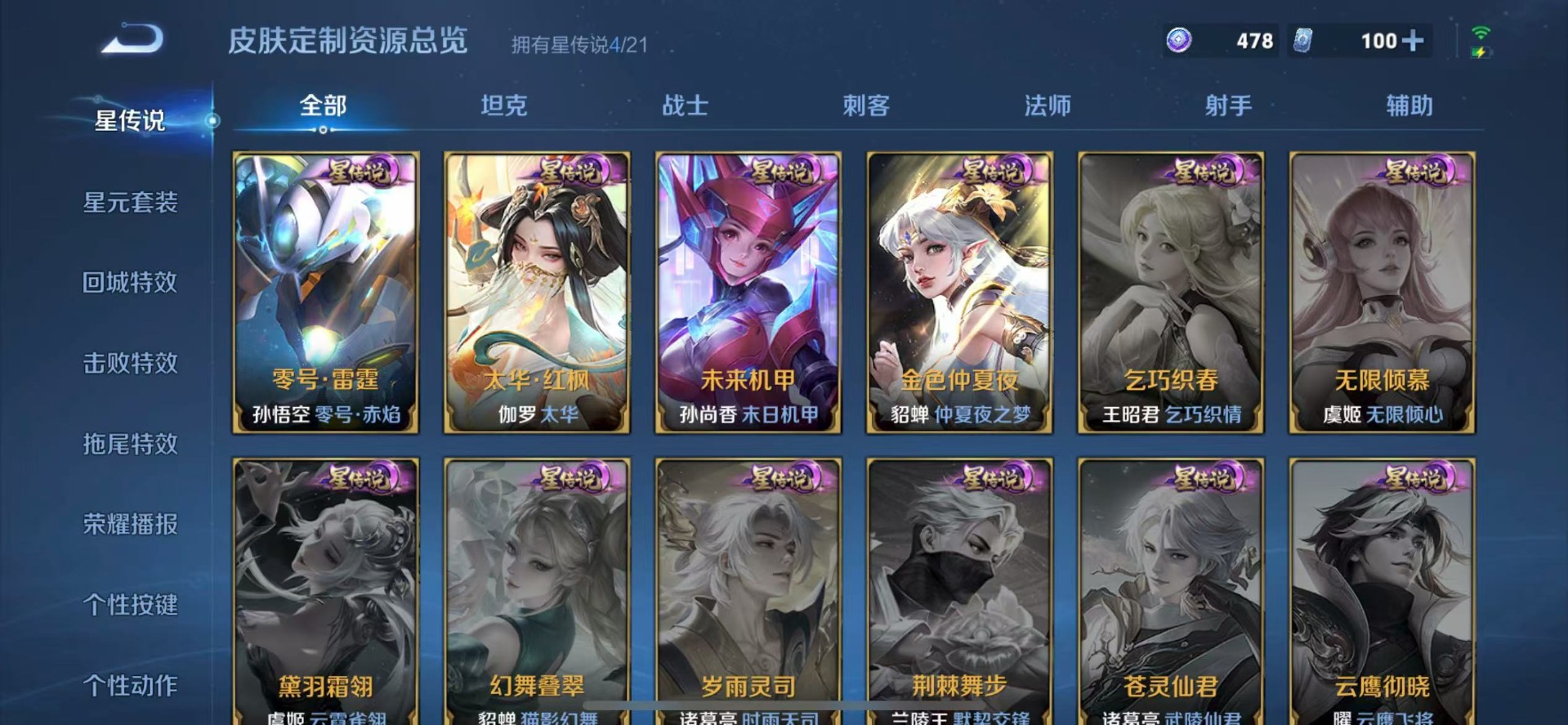 伽罗天狼溯光者,伽罗太华,孙膑天狼运算者,孙尚香异界灵契,吕布御风骁将,露娜启示之音,露娜一生所爱,庄周云端筑梦师,诸葛亮时雨天司,公孙离祈雪灵祝,上官婉儿梁祝,李白诗剑行,花木兰默契交锋,马可波罗逐梦之星,马可波罗山海·玄木吟,艾琳陌上桑,桑启鸣野蒿,孙悟空大圣娶亲,芈月白晶晶,马超神威,赵云引擎之心,云中君时之祈愿,妲己时之彼端,韩信傲雪梅枪,瑶时之祈愿,澜愿照·九州拓,虞姬霸王别姬,王昭君星穹之声,关羽冰锋战神