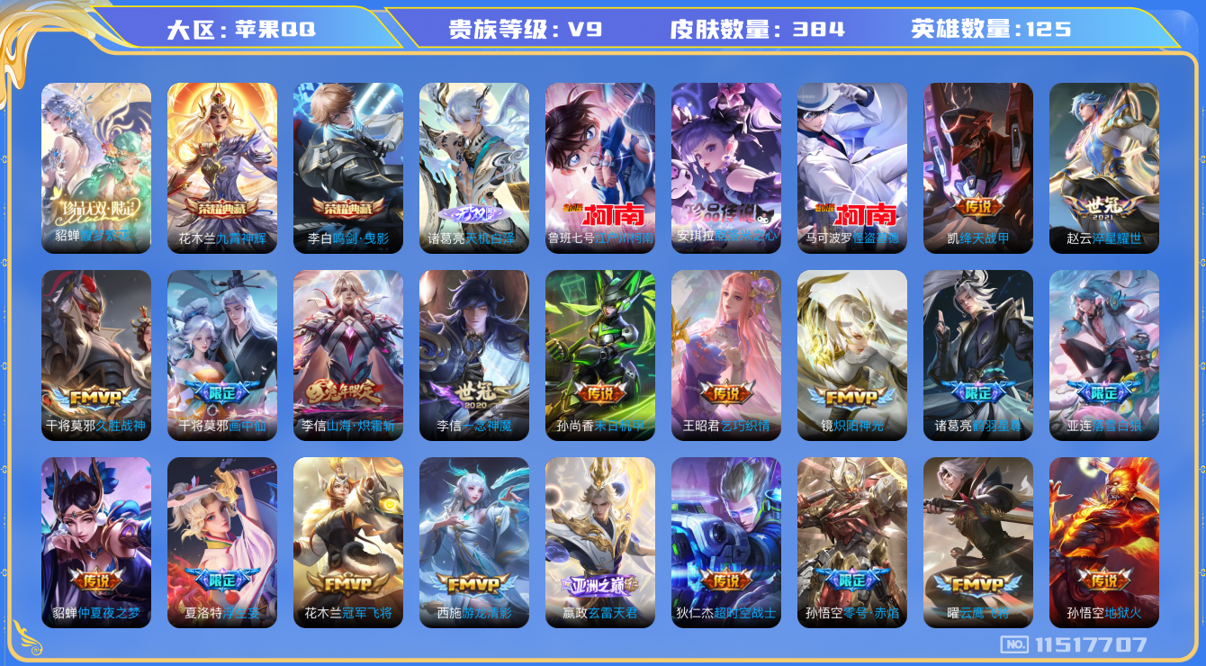 [11517707]V9 2典藏 1珍品无双 1无双 3珍品传说 37传说 125英雄 384皮肤 可修改实名 女号 优质装备:馥梦繁花,鸣剑·曳影,九霄神辉(木兰典藏),天机白泽,江户川柯南,怪盗基德,酷洛米之心,冠军飞将,云鹰飞将(小将军),绛天战甲(鸡嘴战神),久胜战神,炽阳神光,一念神魔,云霓雀翎,末日机甲-孙尚香(绿蚂蚱),地狱火,仲夏夜之梦(大飞蛾),零号·赤焰,李逍遥,乞巧织情,游龙清影(小青龙),淬星耀世,超时空战士-狄仁杰,无双飞将,碎云,山海·炽霜斩(李信年限),画中仙,浮生妄,鹤羽星尊,澜逐花归海,玄雷天君 传说皮:落雪白狼 珍宝阁皮:优雅恋人,女武神 限定皮:愿照·九州拓(澜年限),陌上桑,鸣野蒿,太华(伽罗年限),武陵仙君(小桃花),异界灵契(白毛香),傲雪梅枪,星穹之声,时之彼端,白晶晶,时雨天司(水龙头),神威(电光马子),遇见飞天,高山流水,诗剑行,五谷丰年,冰锋战神,天狼运算者,游园惊梦,梁祝,御风骁将(吕布年限),逐梦之星,天狼溯光者,祈雪灵祝(雪兔子),霸王别姬-虞姬,默契交锋-花木兰,一生所爱,大圣娶亲,引擎之心,云端筑梦师,时之祈愿-云中君,时之祈愿-瑶(瑶传限),启示之音,山海·玄木吟(马可年限) 史诗皮:赞萌露比,鸭鸭历险记-刘禅,狼魂孤将,绮世丹青,龙之律动,百相守梦-周瑜,戍鼓铭心,幻珠鲛人,破空之剑,东方月初,谪仙醉月,百相守梦-百里守约,守夜人,遇见神鹿,紫霞仙子,电玩小子(小书包),白龙吟,黄金分割率,特工魅影,千年之狐,永昼,电玩·爆裂旋风,江河有灵,蒙恬荣光圣徽,偶像歌手,白蛇,暗夜猫娘,魅语,无限星赏官,晚萤,冰冠公主,青蛇,末日机甲-吕布,猫狗日记-孙策,猫狗日记-大乔,时之恋人-孙尚香,乱世虎臣,节奏热浪,修罗,女仆咖啡,摇滚巨星,水果甜心,绅士熊喵,天才门将,星夜王子,心灵骇客,功夫厨神,德古拉伯爵,暗隐猎兽者,幽灵船长,鬼剑武藏,暗渊魔法,心灵战警,天秀·启明,舞动绿茵,地狱岩魂,诗语江南,纤云弄巧,繁星吟游(呼啦呼啦),拒霜思,缤纷独角兽,乘风破浪,逐浪之夏,水晶猎龙者,曙光守护者,热力回旋,箭羽风息,唤灵魅影,金属风暴,原初追逐者,圣诞狂欢,圣诞恋歌,鹰眼统帅,暗夜贵公子,魅力维加斯,黎明之约,赏金猎手,无心,未来纪元-赵云