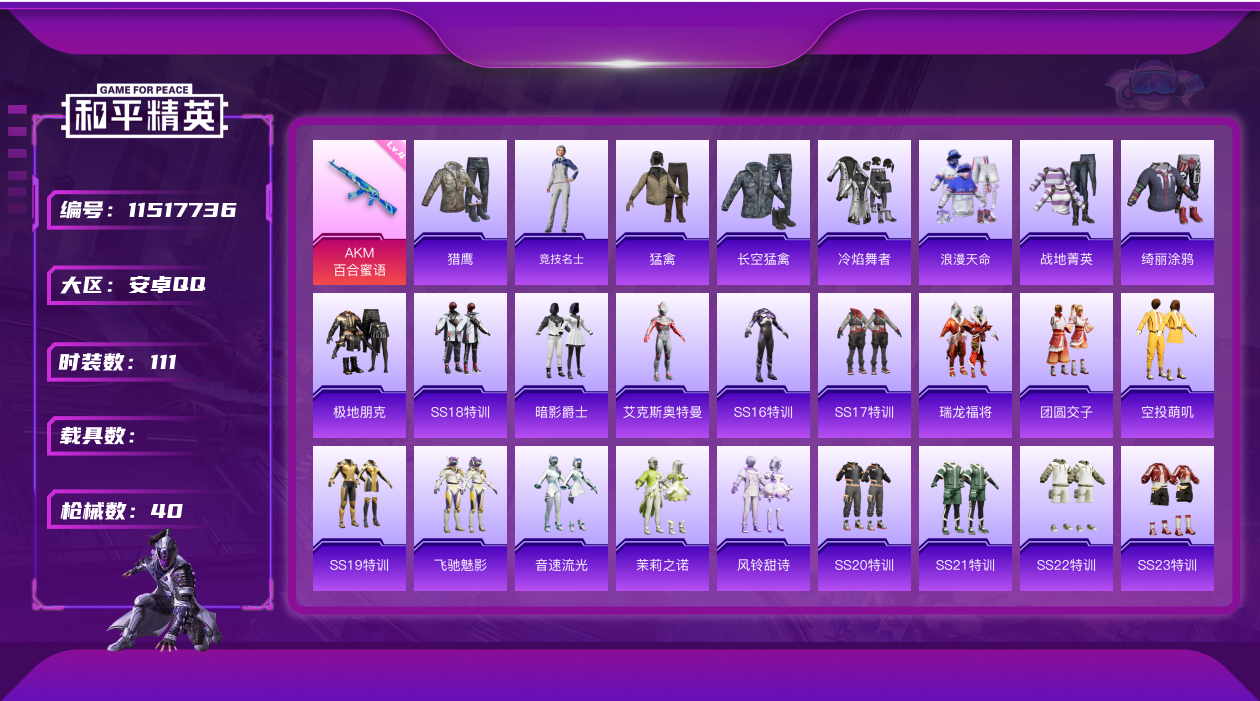 [11517736]1特效枪 2印记 可二次 可修改实名 四级特效枪:四级AKM-百合蜜语 紫色装扮:SS22特训,SS23特训,SS21特训,冷焰舞者,SS20特训,艾克斯奥特曼,SS16特训,暗影爵士,茉莉之诺,风铃甜诗,飞驰魅影,音速流光,SS19特训,瑞龙福将,团圆交子,SS17特训,SS18特训,长空猛禽,虎虎生威吉莉,极地朋克,战地菁英,绮丽涂鸦,福星高照,空投萌叽,炫蓝之夏,猛禽,猎鹰,竞技名士,浪漫天命 优质战备:恐龙拽拽降落伞,飞行器-绮梦青鸾,百合蜜语降落伞