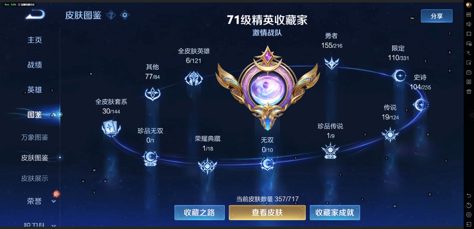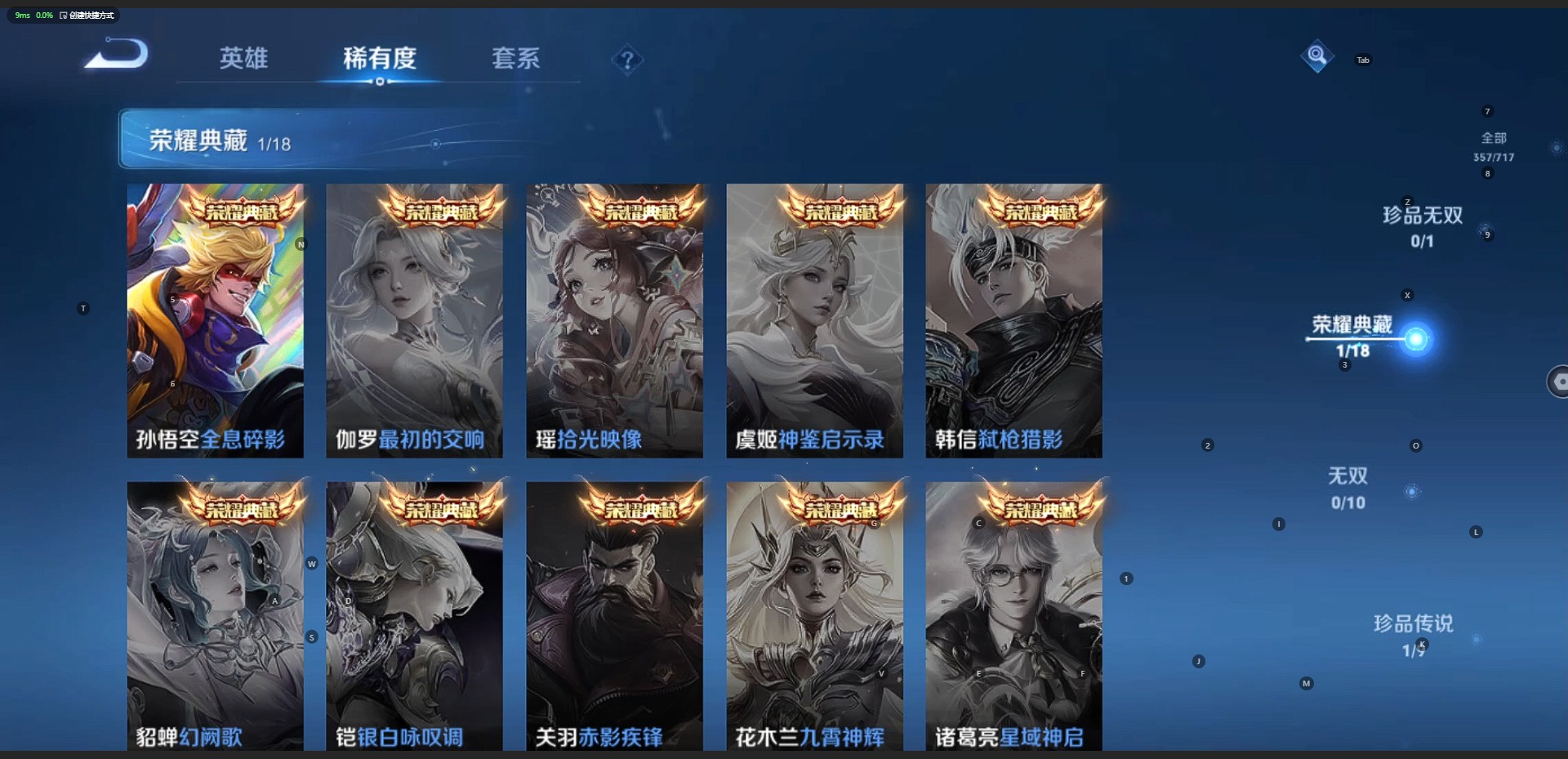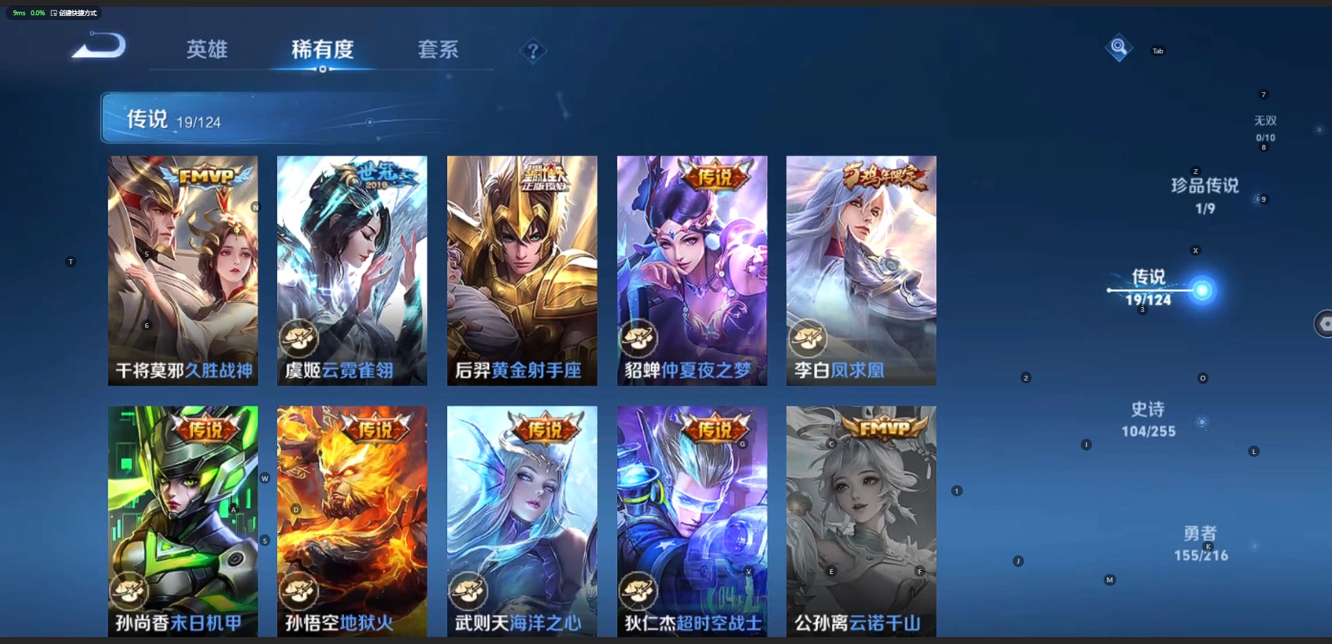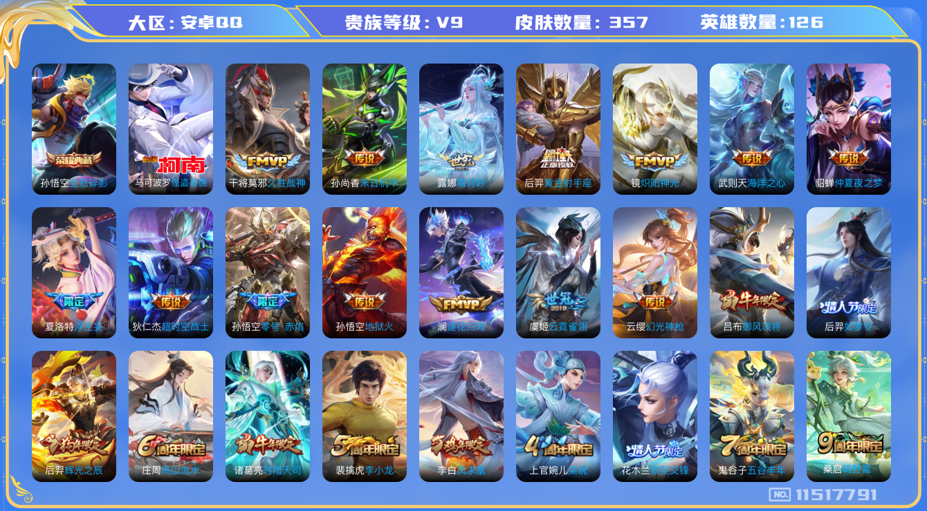 [11517791]V9 1典藏 1珍品传说 19传说 126英雄 357皮肤 典藏英雄武则天 可修改实名 荣耀水晶:全息碎影(猴子典藏) 珍品传说:怪盗基德 传说皮:幻光神枪,黄金射手座,零号·赤焰,地狱火,仲夏夜之梦(大飞蛾),海洋之心,末日机甲-孙尚香(绿蚂蚱),云霓雀翎,久胜战神,炽阳神光,超时空战士-狄仁杰,浮生妄,霜月吟,澜逐花归海 珍宝阁皮:万物之道,优雅恋人,女武神 限定皮:愿照·九州拓(澜年限),鸣野蒿,至尊宝,凤求凰(白切鸡),傲雪梅枪,白晶晶,时雨天司(水龙头),飞衡(韩信年限),高山流水,五谷丰年,冰锋战神,梁祝,御风骁将(吕布年限),李小龙,逐梦之影,朱雀志(守约年限),辉光之辰,如梦令-后羿,霸王别姬-虞姬,默契交锋-花木兰,孙行者,大圣娶亲 史诗皮:星界战将,茶境仙,器灵·浮梦炉,化蝶舞,怒海争锋,破空之剑,紫霞仙子,苍穹之光,电玩小子(小书包),白龙吟,黄金分割率,特工魅影,千年之狐,电玩·爆裂旋风,鹤归松栖(赵怀真),冰冠公主,百解令(蒙犽),高渐离燃音魔法,蒙恬荣光圣徽,偶像歌手,青蛇,暗夜猫娘,魅语,龙骑士(小龙虾),末日机甲-吕布,猫狗日记-孙策,猫狗日记-大乔,乱世虎臣,节奏热浪,修罗,女仆咖啡,摇滚巨星,水果甜心,绅士熊喵,天才门将,星夜王子,心灵骇客,功夫厨神,德古拉伯爵,暗隐猎兽者,幽灵船长,鬼剑武藏,暗渊魔法,心灵战警,乐园奇幻夜,地狱岩魂,纤云弄巧,繁星吟游(呼啦呼啦),拒霜思,缤纷独角兽,乘风破浪,逐浪之夏,月团寄思,水晶猎龙者,曙光守护者,箭羽风息,金属风暴,原初追逐者,圣诞狂欢,圣诞恋歌,鹰眼统帅,暗夜贵公子,魅力维加斯,黎明之约,无心,未来纪元-赵云