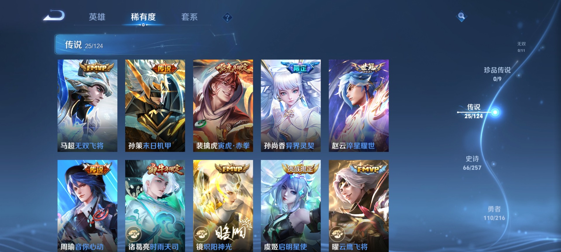 [11517892]V8 25传说 122英雄 273皮肤 可修改实名 传说皮:黄金射手座,一念神魔,淬星耀世,久胜战神,猫影幻舞,云鹰飞将(小将军),炽阳神光,无双飞将,音你心动-周瑜,超时空战士-狄仁杰,末日机甲-孙策,碎云,神器·狴犴令,画中仙,浮生妄 珍宝阁皮:蔷薇恋人,玩趣恶龙 限定皮:至尊宝,异界灵契(白毛香),傲雪梅枪,寅虎·展翼(孙膑年限),前尘镜,星穹之声,绯月行,时雨天司(水龙头),遇见飞天,高山流水,诗剑行,齐天大圣,怒海麟威,五谷丰年,青龙志(铠年限),梁祝,天狼狩猎者,天狼绘梦者,李小龙,朱雀志(守约年限),霸王别姬-虞姬,孙行者,大圣娶亲,寅虎·御盾(廉颇年限),寅虎·心曲(虎婆),寅虎·赤拳(老虎年限) 史诗皮:遇见神鹿,黄金分割率,特工魅影,末日机甲-吕布,猫狗日记-大乔,时之恋人-孙尚香,乱世虎臣,节奏热浪,修罗,女仆咖啡,水果甜心,绅士熊喵,天才门将,星夜王子,心灵骇客,功夫厨神,德古拉伯爵,暗隐猎兽者,幽灵船长,鬼剑武藏,地狱岩魂,纤云弄巧,缤纷独角兽,乘风破浪,逐浪之夏,水晶猎龙者,热力回旋,箭羽风息,金属风暴,圣诞狂欢,圣诞恋歌,鹰眼统帅,赏金猎手,寅虎·御盾,千筹问战,无心,未来纪元-赵云