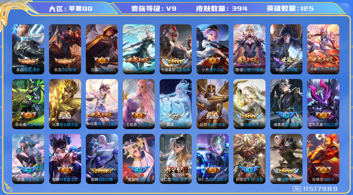 [11517989]V9 2典藏 39传说 125英雄 394皮肤 可修改实名 优质装备:鸣剑·曳影,赤影疾锋,黄金狮子座,黄金射手座,云鹰飞将(小将军),猫影幻舞,久胜战神,炽阳神光,一念神魔,末日机甲-孙尚香(绿蚂蚱),地狱火,仲夏夜之梦(大飞蛾),音你心动-小乔,零号·赤焰,地狱之眼,李逍遥,乞巧织情,时之恋人-刘备(电焊工),超时空战士-狄仁杰,无双飞将,神器·狴犴令,山海·炽霜斩(李信年限),浮生妄,鹤羽星尊,霜月吟,澜逐花归海 传说皮:乘龙·问璇玑(孙尚香年限),乘龙·铭钟鼎(赵云年限),乘龙·淬吴钩(孙策年限),落雪白狼 珍宝阁皮:优雅恋人,蔷薇恋人,玩趣恶龙 限定皮:鸣野蒿,至尊宝,白虎志(电光耗子),凤求凰(白切鸡),梅西,傲雪梅枪,绯月行,白鹤梁神女,白晶晶,时雨天司(水龙头),神威(电光马子),飞衡(韩信年限),瑞麟志(木兰年限),高山流水,诗剑行,五谷丰年,青龙志(铠年限),冰锋战神,武圣,御风骁将(吕布年限),逐梦之星,烈魂,岱宗(典韦年限),天狼溯光者,奔雷神使(牛魔年限),祈雪灵祝(雪兔子),天狼绘梦者,李小龙,逐梦之影,玄武志(苏烈年限),朱雀志(守约年限),辉光之辰,如梦令-嫦娥,霸王别姬-项羽,霸王别姬-虞姬,默契交锋-兰陵王,默契交锋-花木兰,孙行者,猪悟能,一生所爱,大圣娶亲,青春决赛季,冰霜恋舞曲,云端筑梦师,乒乒小将,寅虎·御盾(廉颇年限),深海之息(深海大菠萝),山海·玄木吟(马可年限) 史诗皮:石田雨龙,琥珀纪元伽罗,百相守梦-黄忠,紫霞仙子,苍穹之光,电玩小子(小书包),白龙吟,黄金分割率,特工魅影,千年之狐,永昼,鹤归松栖(赵怀真),江河有灵,百解令(蒙犽),高渐离燃音魔法,蒙恬荣光圣徽,偶像歌手,龙骑士(小龙虾),暗夜猫娘,魅语,晚萤,冰冠公主,末日机甲-吕布,猫狗日记-孙策,猫狗日记-大乔,乱世虎臣,节奏热浪,修罗,女仆咖啡,摇滚巨星,水果甜心,天才门将,星夜王子,心灵骇客,功夫厨神,德古拉伯爵,暗隐猎兽者,幽灵船长,鬼剑武藏,暗渊魔法,心灵战警,天秀·启明,舞动绿茵,地狱岩魂,纤云弄巧,繁星吟游(呼啦呼啦),拒霜思,缤纷独角兽,乘风破浪,逐浪之夏,龙鼓争鸣,月团寄思,水晶猎龙者,热力回旋,箭羽风息,金属风暴,原初追逐者,圣诞狂欢,圣诞恋歌,鹰眼统帅,暗夜贵公子,黎明之约,雪上飞焰,赏金猎手,寅虎·御盾,顽趣-阿古朵,无心,未来