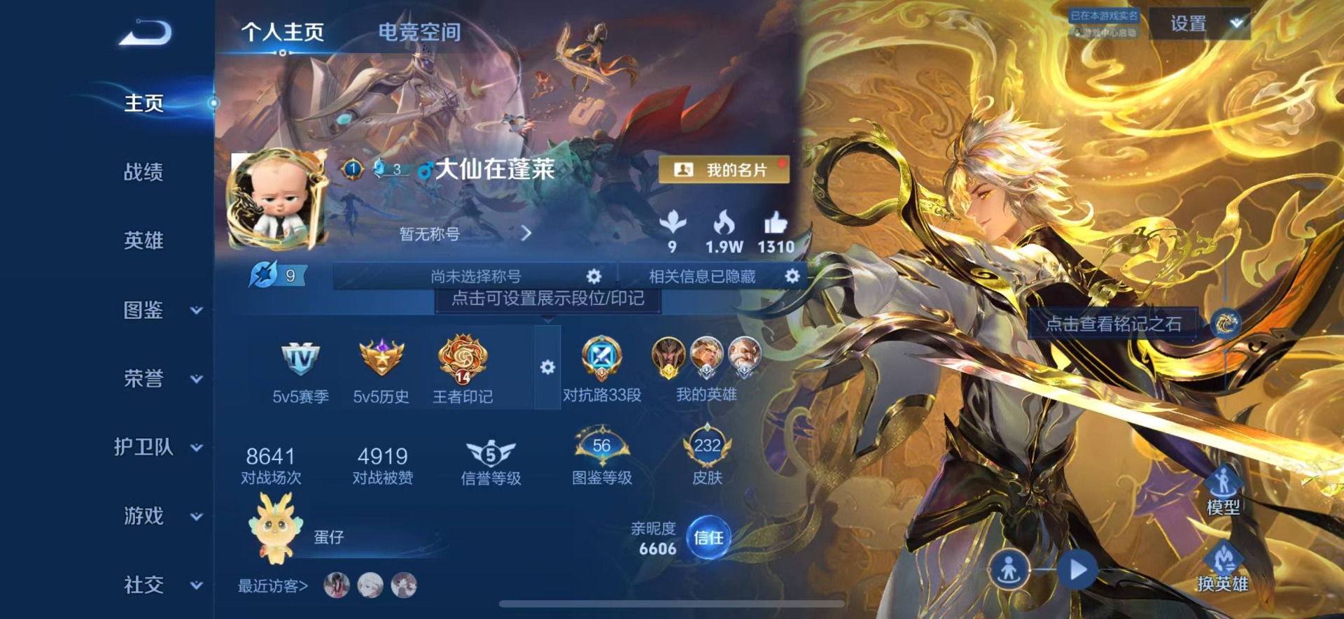 - [11554084]V8 1典藏 16传说 125英雄 316皮肤 可修改实名 优质装备:无限飓风号(高达),黄金射手座,地狱火,零号·赤焰,乞巧织情,淬星耀世 珍宝阁皮:妄想食味,蔷薇恋人 限定皮:愿照·山河定(司空震年限),逐霄战戟,鸣野蒿,至尊宝,凤求凰(白切鸡),傲雪梅枪,时雨天司(水龙头),瑞麟志(木兰年限),遇见飞天,高山流水,诗剑行,齐天大圣,匿光决锋者,怒海麟威,降魔,五谷丰年,游园惊梦,梁祝,御风骁将(吕布年限),李小龙,朱雀志(守约年限),默契交锋-兰陵王,孙行者,猪悟能,大圣娶亲,天魔缭乱,美猴王,枫霜尽,山海·玄木吟(马可年限) 史诗皮:苍鳞隐世,器灵·浮梦炉,龙之律动,百相守梦-黄忠,紫霞仙子,苍穹之光,白龙吟,黄金分割率,特工魅影,千年之狐,永昼,百相守梦(刘备),百相守梦(关羽),电玩·爆裂旋风,百解令(蒙犽),蒙恬荣光圣徽,龙骑士(小龙虾),魅语,末日机甲-吕布,猫狗日记-孙策,时之恋人-孙尚香,乱世虎臣,节奏热浪,摇滚巨星,水果甜心,天才门将,星夜王子,心灵骇客,时之奇旅-安琪拉,功夫厨神,德古拉伯爵,暗隐猎兽者,幽灵船长,鬼剑武藏,暗渊魔法,心灵战警,地狱岩魂,纤云弄巧,繁星吟游(呼啦呼啦),拒霜思,乘风破浪,水晶猎龙者,曙光守护者,唤灵魅影,金属风暴,圣诞狂欢,圣诞恋歌,鹰眼统帅,魅力维加斯,无心,未来纪元-赵云