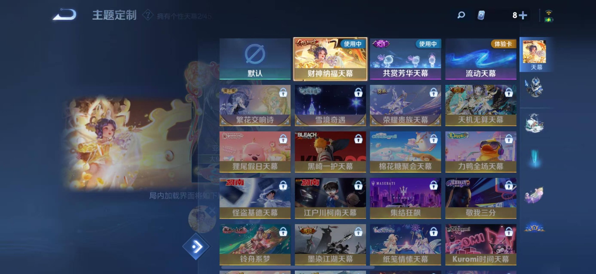 大乔白蛇,大乔猫狗日记,刘邦德古拉伯爵,夏侯惇乘风破浪,阿轲节奏热浪,铠曙光守护者,曹操幽灵船长,廉颇地狱岩魂,小乔缤纷独角兽,孙策猫狗日记,鲁班七号电玩小子,吕布圣诞狂欢,露娜紫霞仙子,吕布末日机甲,诸葛亮黄金分割率,刘禅电玩·爆裂旋风,刘禅天才门将,宫本武藏鬼剑武藏,公孙离无限星赏官,兰陵王暗隐猎兽者,貂蝉圣诞恋歌,花木兰水晶猎龙者,李白千年之狐,安琪拉心灵骇客,安琪拉时之奇旅,白起星夜王子,亚瑟心灵战警,嬴政摇滚巨星,程咬金功夫厨神,百里玄策原初追逐者,雅典娜黎明之约,李元芳逐浪之夏,百里守约特工魅影,墨子龙骑士,墨子金属风暴,蔡文姬舞动绿茵,娜可露露晚萤,王昭君偶像歌手,嫦娥拒霜思,橘右京修罗