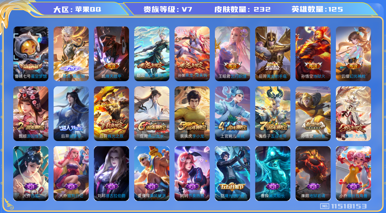 [11518153]V7 1典藏 1无双 8传说 125英雄 232皮肤 可修改实名 优质装备:星空梦想(太空人),器灵·螭龙剑,黄金射手座,绛天战甲(鸡嘴战神),地狱火,乞巧织情 传说皮:乘龙·铭钟鼎(赵云年限),乘龙·淬吴钩(孙策年限),幻光神枪 珍宝阁皮:优雅恋人,蔷薇恋人,女武神 限定皮:愿照·九州拓(澜年限),高山流水,五谷丰年,游园惊梦,梁祝,李小龙,辉光之辰,如梦令-后羿,孙行者 史诗皮:石田雨龙,紫霞仙子,电玩小子(小书包),黄金分割率,特工魅影,千年之狐,江河有灵,蒙恬荣光圣徽,偶像歌手,晚萤,无限星赏官,白蛇,电玩·爆裂旋风,龙骑士(小龙虾),末日机甲-吕布,猫狗日记-孙策,猫狗日记-大乔,节奏热浪,修罗,女仆咖啡,摇滚巨星,水果甜心,天才门将,星夜王子,心灵骇客,时之奇旅-安琪拉,功夫厨神,德古拉伯爵,暗隐猎兽者,幽灵船长,鬼剑武藏,心灵战警,舞动绿茵,地狱岩魂,拒霜思,缤纷独角兽,乘风破浪,逐浪之夏,水晶猎龙者,曙光守护者,金属风暴,原初追逐者,圣诞狂欢,圣诞恋歌,鹰眼统帅,魅力维加斯,黎明之约,无心,未来纪元-赵云