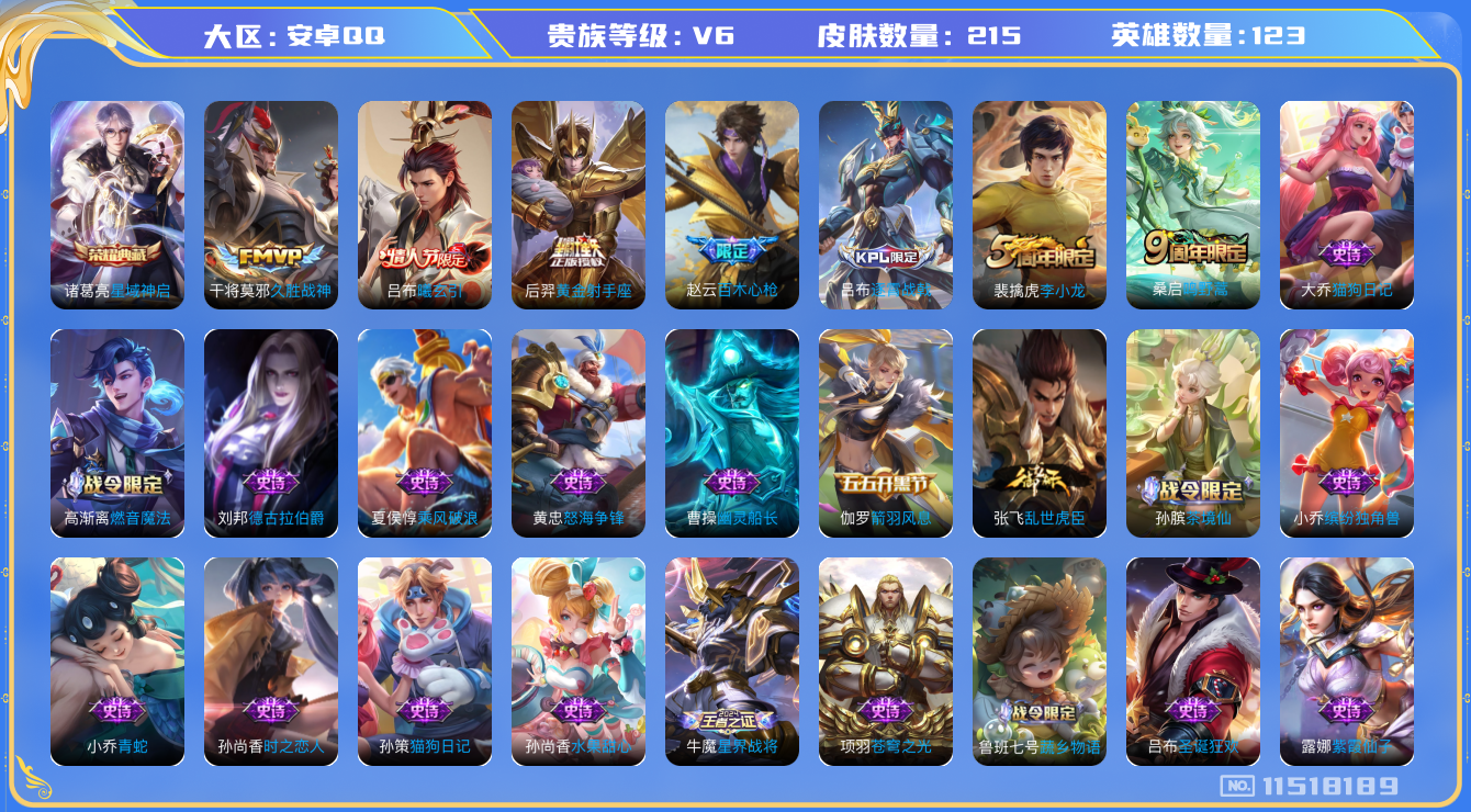 [11518189]V6 1典藏 4传说 123英雄 215皮肤 可修改实名 荣耀水晶:星域神启(倪克斯贼亮) 传说皮:吕布曦玄引,黄金射手座,久胜战神 珍宝阁皮:胡桃夹子,蔷薇恋人 限定皮:逐霄战戟,鸣野蒿,李小龙,百木心枪 史诗皮:星界战将,茶境仙,龙之律动,百相守梦-百里守约,战舞者,蒙犽顽岩魄,怒海争锋,蔬乡物语(鲁班七号),破空之剑,紫霞仙子,苍穹之光,黄金分割率,特工魅影,千年之狐,高渐离燃音魔法,百解令(蒙犽),冰冠公主,青蛇,偶像歌手,猫狗日记-孙策,猫狗日记-大乔,时之恋人-孙尚香,乱世虎臣,修罗,女仆咖啡,摇滚巨星,水果甜心,星夜王子,心灵骇客,功夫厨神,德古拉伯爵,暗隐猎兽者,幽灵船长,鬼剑武藏,心灵战警,天秀·启明,纤云弄巧,繁星吟游(呼啦呼啦),缤纷独角兽,乘风破浪,逐浪之夏,水晶猎龙者,箭羽风息,金属风暴,原初追逐者,圣诞狂欢,鹰眼统帅,魅力维加斯,未来纪元-赵云