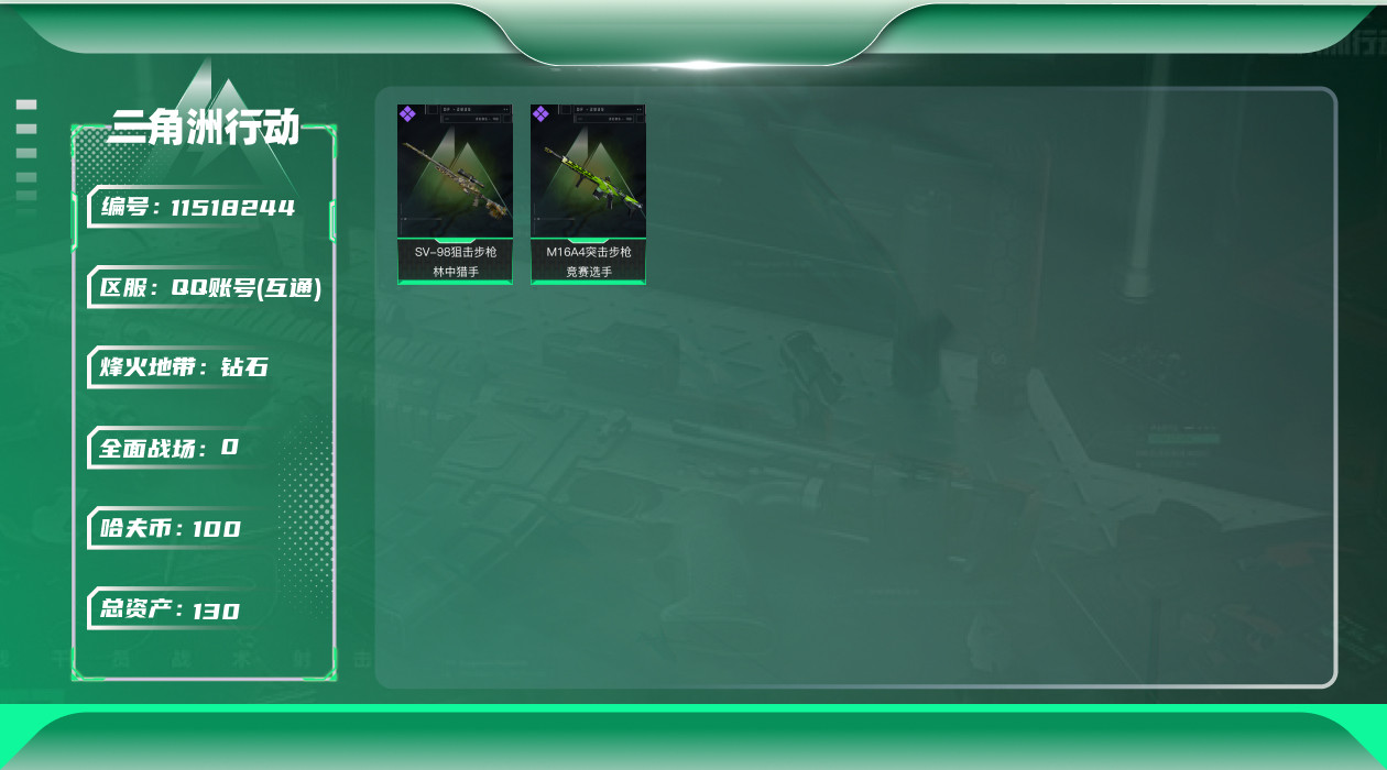 [11518244]总资产:130.6 可二次 可修改实名 烽火地带段位:钻石 全面战场段位:无段位 哈夫币:100 史诗武器皮肤:M16A4突击步枪-竞赛选手,SV-98狙击步枪-林中猎手