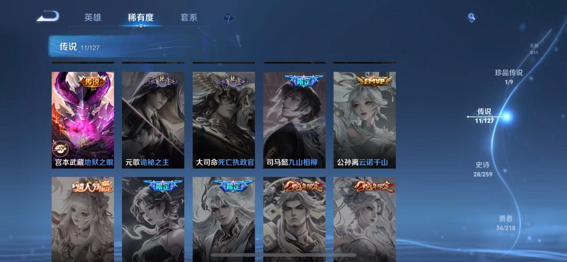 宫本武藏鬼剑武藏,貂蝉圣诞恋歌,夏侯惇乘风破浪,花木兰水晶猎龙者,夏洛特永昼,白起苍鳞隐世,亚瑟心灵战警,孙尚香时之恋人,百里玄策原初追逐者,雅典娜冰冠公主,百里守约特工魅影,墨子金属风暴,澜赏金猎手,诸葛亮黄金分割率,钟馗乐园奇幻夜,刘禅绅士熊喵