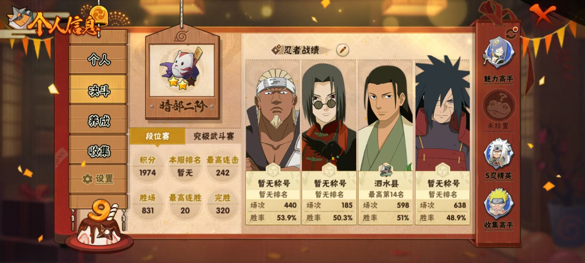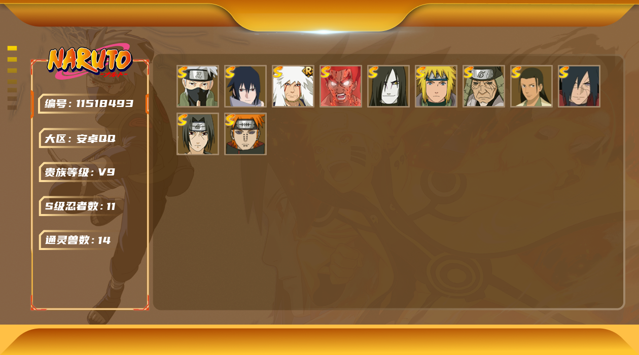 [11518493]V9 11S忍 23A忍 14通灵 727.1W战力 可二次 可修改实名 优质装备:猿飞日斩「秽土转生」,迈特凯「死门」,宇智波佐助「永恒万花筒」,千手柱间·木叶创立,宇智波斑「秽土转生·解」,旗木卡卡西「须佐能乎」 S级忍者:自来也 「舞之豪杰」,宇智波鼬 「须佐能乎」,佩恩「天道」,波风水门,大蛇丸