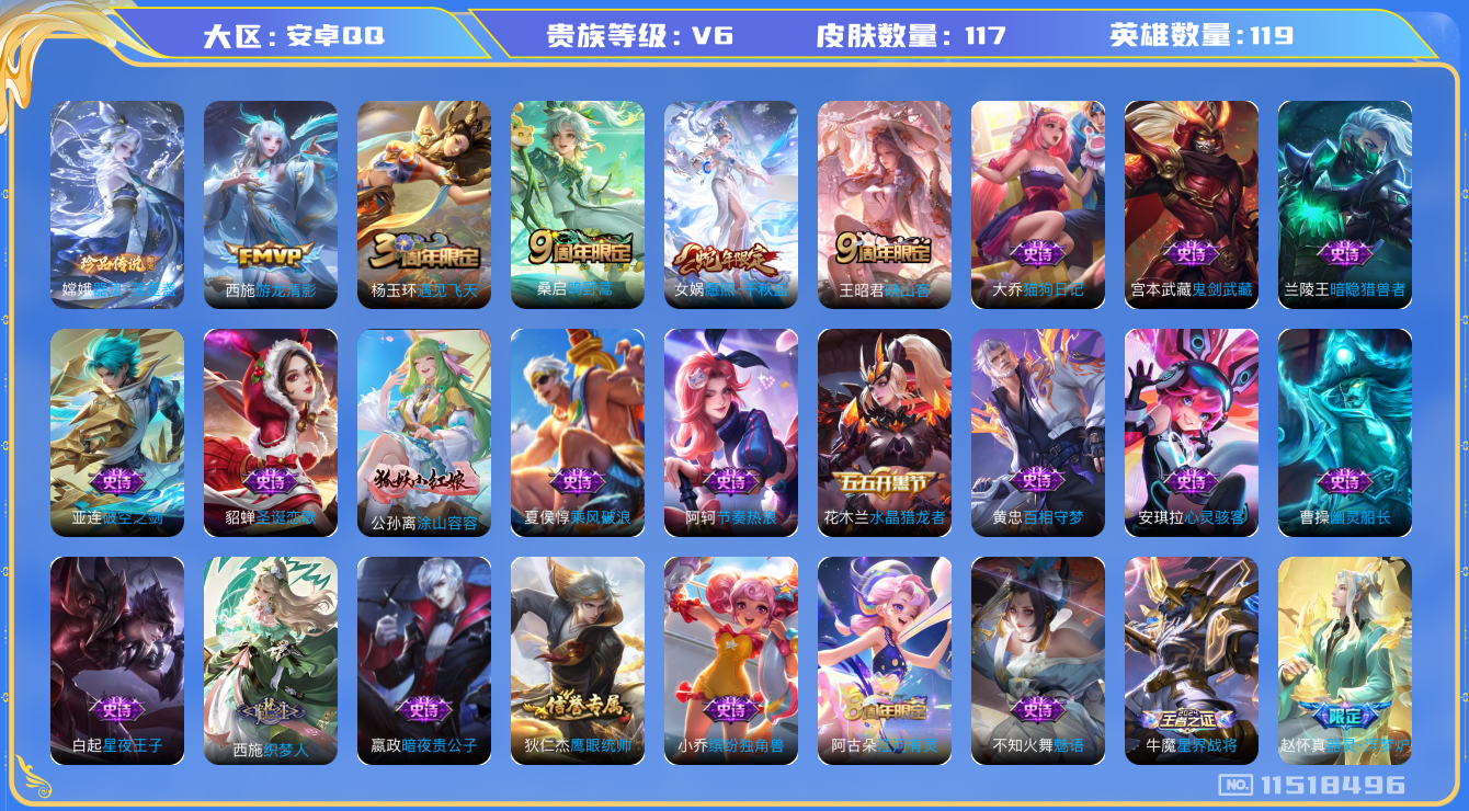 [11518496]V6 1珍品传说 4传说 119英雄 117皮肤 可修改实名 女号 优质装备:器灵·落星盏,游龙清影(小青龙),涂山容容 珍宝阁皮:万物之道 限定皮:愿照·千秋盛(女娲年限),映山客,鸣野蒿,遇见飞天 史诗皮:器灵·浮梦炉,星界战将,炽弈燎原,破空之剑,百相守梦-黄忠,织梦人,紫霞仙子,江河有灵,魅语,蒙恬荣光圣徽,猫狗日记-大乔,节奏热浪,天才门将,星夜王子,心灵骇客,暗隐猎兽者,幽灵船长,鬼剑武藏,拒霜思,缤纷独角兽,乘风破浪,逐浪之夏,水晶猎龙者,圣诞恋歌,鹰眼统帅,暗夜贵公子