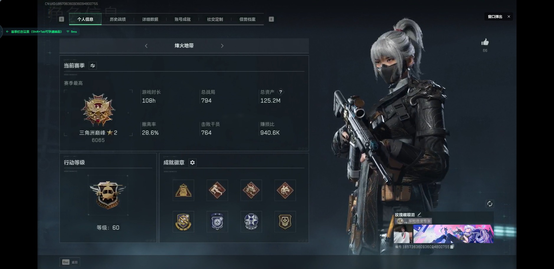 [11518747]可二次 可修改实名 实名:可修改 烽火地带段位:三角洲巅峰 全面战场段位:军士长 总资产:125.2 哈夫币:42.935 传说武器皮肤:近战-北极星,SCAR-H战斗步枪-水墨云图,AK-12突击步枪-夜鹰,SMG45冲锋枪-骑士,复合弓-黑-天际线,725双管霰弹枪-送葬人-无题密令,M4A1突击步枪-蚀金玫瑰 史诗武器皮肤:SR-25射手步枪-尖端治疗,PKM通用机枪-荒野求生,AS Val突击步枪-尖端治疗,M700狙击步枪-守夜人,SG552突击步枪-尖端治疗,Ash-12战斗步枪-守夜人,MP5冲锋枪-深海恐惧,SR-3M紧凑突击步枪-荒野求生,勇士冲锋枪-深海恐惧,AKM突击步枪-林中猎手,M16A4突击步枪-竞赛选手,PKM通用机枪-守夜人,SVD狙击步枪-荒野求生,M1014霰弹枪-林中猎手,SV-98狙击步枪-林中猎手,PTR-32突击步枪-英雄,PSG-1射手步枪-无垢,M250通用机枪-囚徒,SV-98狙击步枪-囚徒,SCAR-H战斗步枪-囚徒,MP7冲锋枪-无垢,Vector冲锋枪-阿萨拉文明 干员外观:红狼-蚀金玫瑰,骇爪-水墨云图