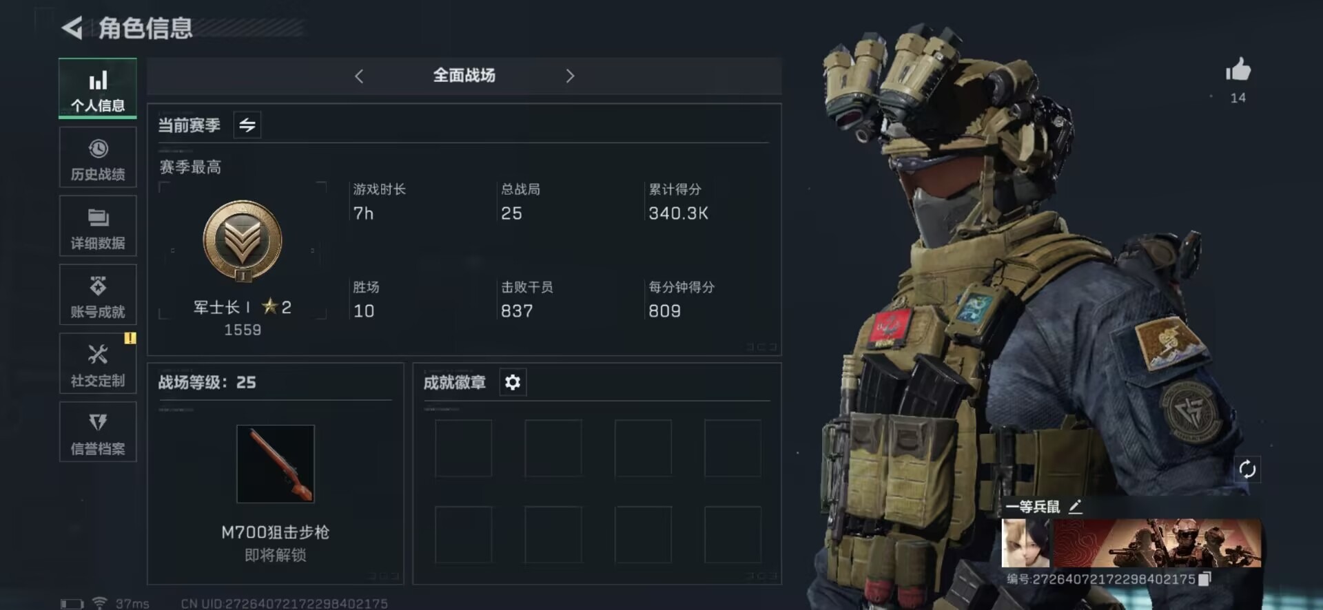 [11518791]总资产:187.9 3传说枪械 顶级安全箱(3×3)9.15号到期 可二次 可修改实名 烽火地带段位:黄金 全面战场段位:军士长 哈夫币:54.106 传说武器皮肤:复合弓-黑-天际线,CAR-15突击步枪-阿米娅,725双管霰弹枪-送葬人-无题密令 史诗武器皮肤:PKM通用机枪-荒野求生,SR-3M紧凑突击步枪-荒野求生,SG552突击步枪-深海恐惧,SVD狙击步枪-荒野求生,SV-98狙击步枪-林中猎手,PSG-1射手步枪-无垢,SCAR-H战斗步枪-囚徒,MP7冲锋枪-无垢