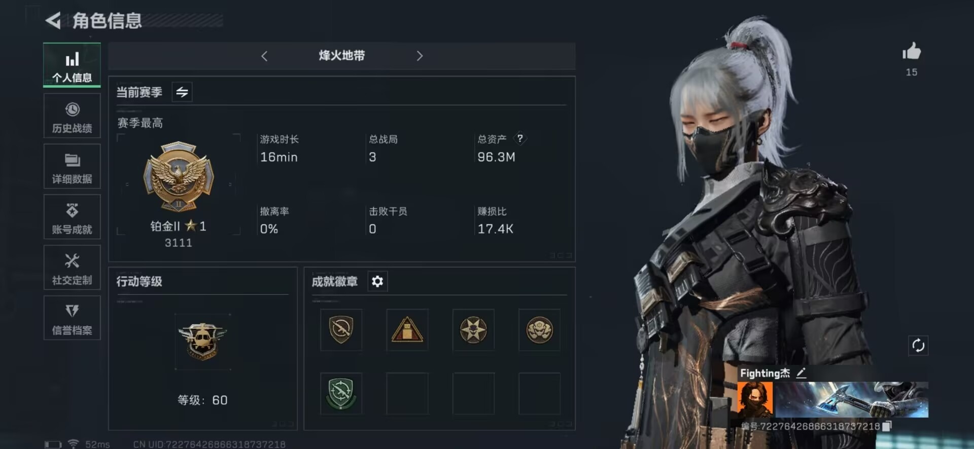 - [11682854]总资产:261.9M 2干员外观 1近战传说 12传说枪械 哈夫币:21.009K 可二次 可修改实名 优质装备:近战-北极星 烽火地带段位:无段位 全面战场段位:无段位 传说武器皮肤:SCAR-H战斗步枪-水墨云图,腾龙突击步枪-黎明警戒,SMG45冲锋枪-骑士,G18-飞虎,M4A1突击步枪-工业审判,M14射手步枪-工业审判,M1014霰弹枪-工业审判,K437突击步枪-北极星,QCQ171冲锋枪-北极星,AK-12突击步枪-夜鹰,M4A1突击步枪-蚀金玫瑰 史诗武器皮肤:K416突击步枪-暗鸦,AUG突击步枪-蝮蛇,G3战斗步枪-战场英杰,AKM突击步枪-林中猎手,SV-98狙击步枪-林中猎手,PTR-32突击步枪-英雄,SVD狙击步枪-阿萨拉工艺,PKM通用机枪-英雄 干员外观:骇爪-水墨云图,威龙-飞虎