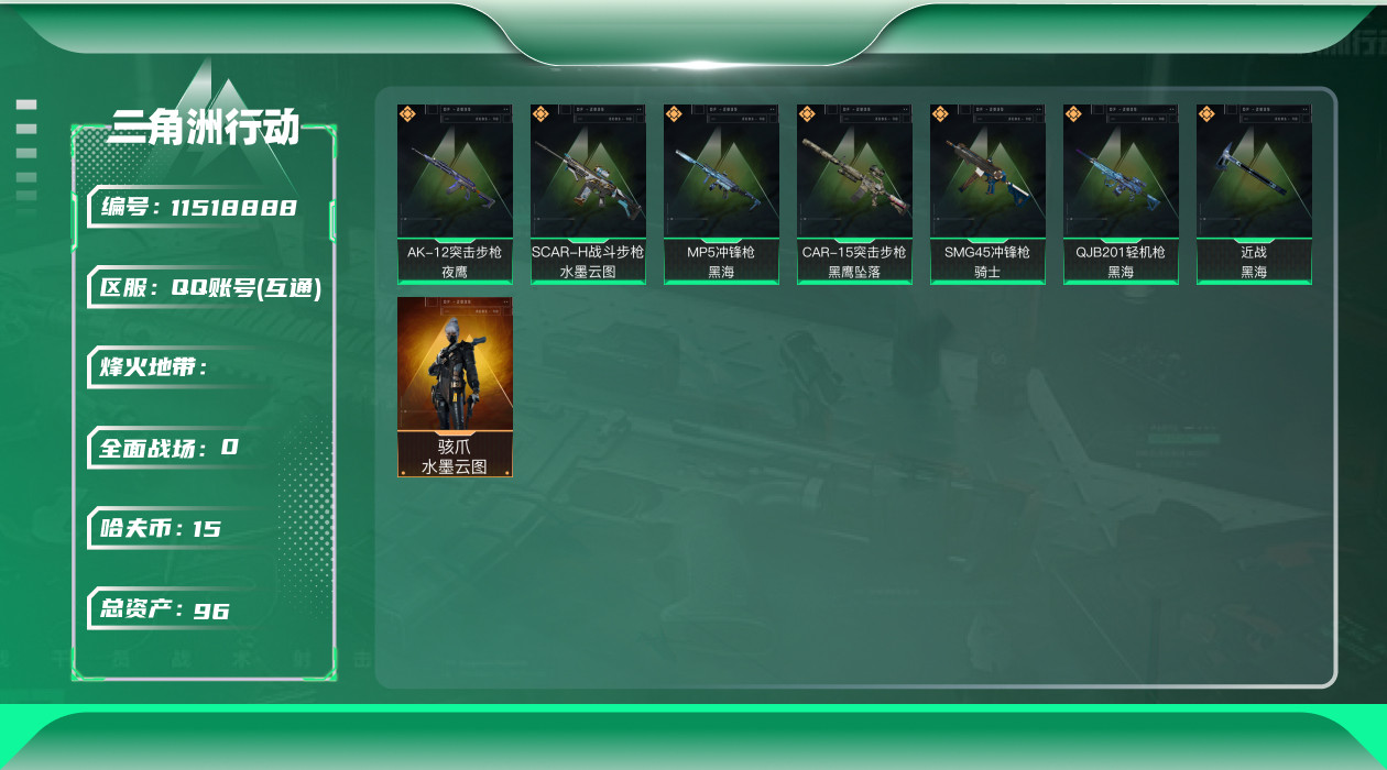 [11518888]可二次 可修改实名 实名:可修改 总资产:96.3 哈夫币:15.264 传说武器皮肤:近战-黑海,SCAR-H战斗步枪-水墨云图,AK-12突击步枪-夜鹰,SMG45冲锋枪-骑士,QJB201轻机枪-黑海,MP5冲锋枪-黑海,CAR-15突击步枪-黑鹰坠落 干员外观:骇爪-水墨云图