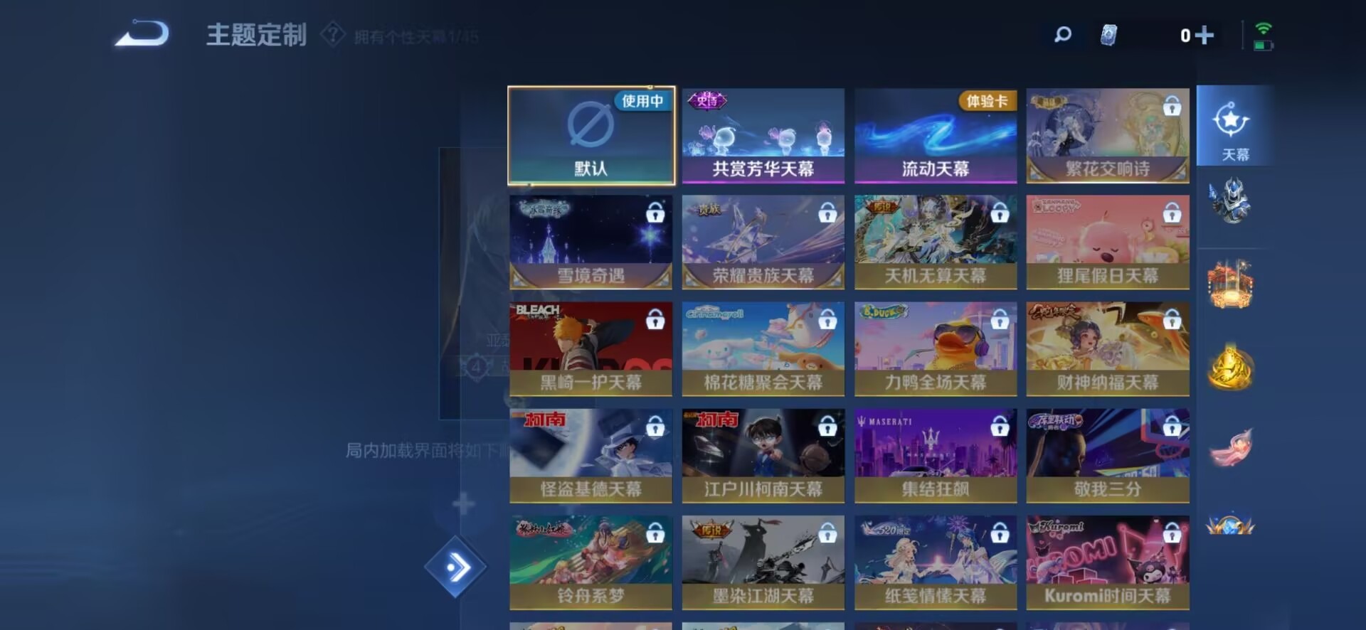 高渐离天秀·音浪,刘邦德古拉伯爵,夏侯惇乘风破浪,阿轲节奏热浪,铠曙光守护者,曹操幽灵船长,小乔缤纷独角兽,孙策猫狗日记,吕布圣诞狂欢,吕布末日机甲,诸葛亮黄金分割率,司马懿暗渊魔法,刘禅天才门将,宫本武藏鬼剑武藏,公孙离无限星赏官,兰陵王暗隐猎兽者,貂蝉圣诞恋歌,花木兰水晶猎龙者,夏洛特永昼,李白千年之狐,安琪拉心灵骇客,安琪拉时之奇旅,杨戬天秀·启明,白起星夜王子,亚瑟心灵战警,张良千筹问战,嬴政摇滚巨星,嬴政暗夜贵公子,程咬金功夫厨神,百里玄策热力回旋,雅典娜冰冠公主,李元芳逐浪之夏,百里守约特工魅影,墨子金属风暴,王昭君偶像歌手,嫦娥拒霜思,橘右京修罗