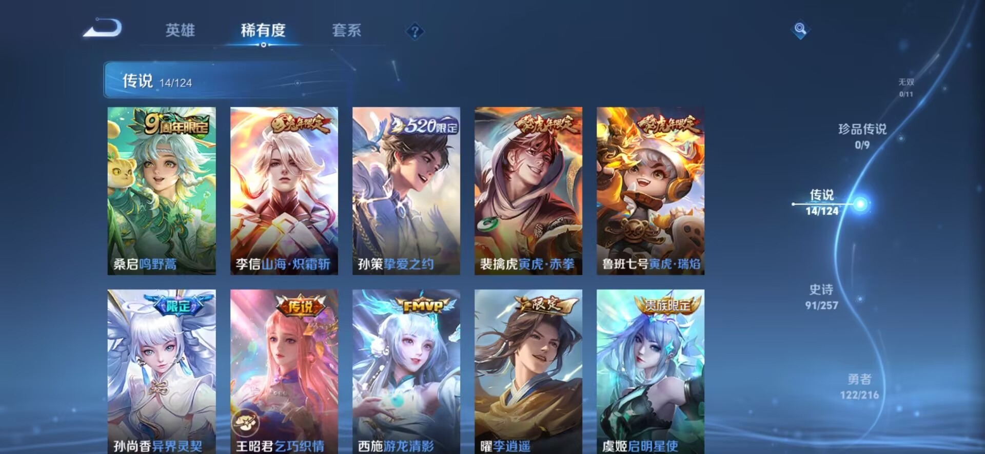- PX_2085697-05 安卓QQ/至尊星耀/87皮肤/95英雄/0典藏/0珍品无双/0无双/0珍品传说/5传说/12史诗/4稀有英雄 【5 传说皮肤】云霓雀翎 虞姬,黄金射手座 后羿,怒海麟威 吕布,绛天战甲 铠,鸣野蒿 桑启, 【12 史诗皮肤】蔬乡物语 鲁班七号,紫霞仙子 露娜,鬼剑武藏 宫本武藏,纤云弄巧 云中君,未来纪元 赵云,魔术师 狄仁杰,皇家上将 赵云,撼地雄心 廉颇,破空之剑