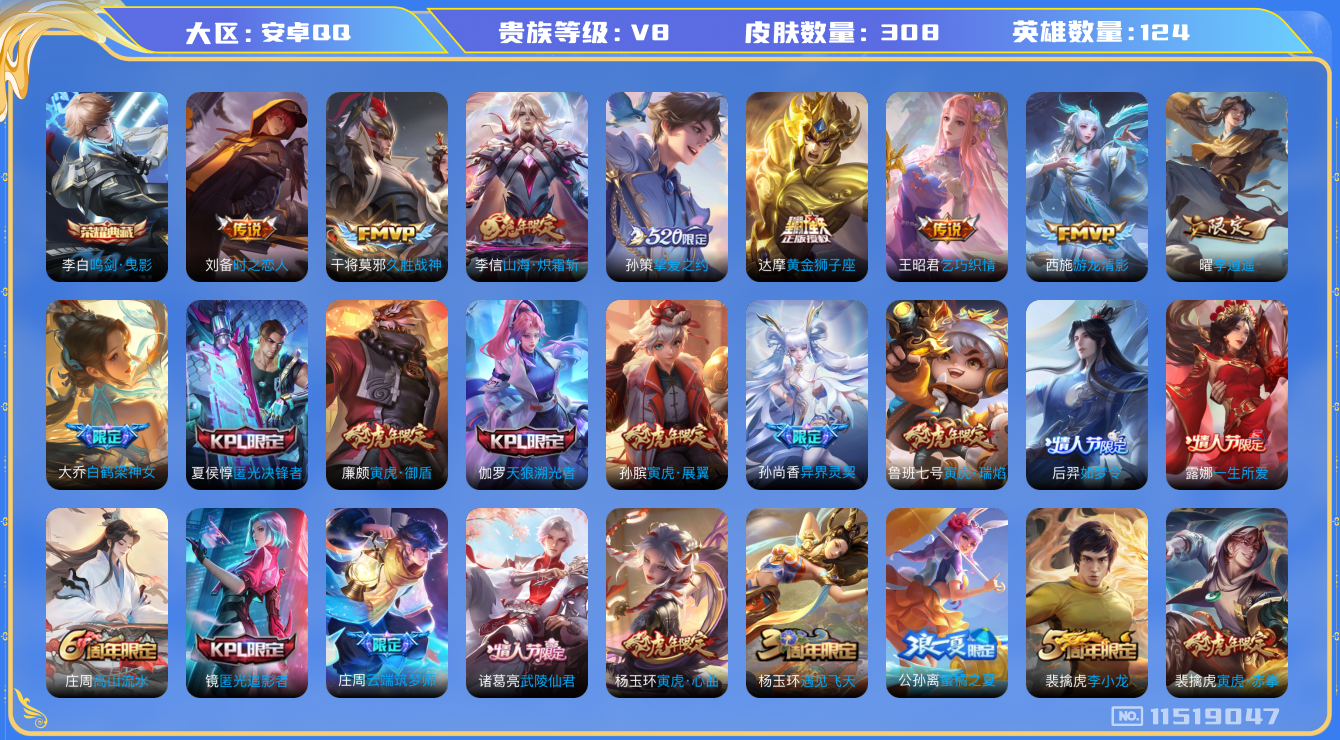 [11519047]V8 1典藏 14传说 124英雄 308皮肤 可修改实名 荣耀水晶:鸣剑·曳影 传说皮:李逍遥,游龙清影(小青龙),山海·炽霜斩(李信年限),黄金狮子座,久胜战神,乞巧织情,时之恋人-刘备(电焊工),挚爱之约 珍宝阁皮:优雅恋人,蔷薇恋人,女武神 限定皮:鸣野蒿,武陵仙君(小桃花),异界灵契(白毛香),傲雪梅枪,寅虎·展翼(孙膑年限),白鹤梁神女,飞衡(韩信年限),遇见飞天,高山流水,匿光决锋者,五谷丰年,冰锋战神,梁祝,天狼溯光者,李小龙,逐梦之影,朱雀志(守约年限),如梦令-后羿,霸王别姬-虞姬,孙行者,一生所爱,青春决赛季,云端筑梦师,蜜橘之夏,匿光追影者,寅虎·御盾(廉颇年限),寅虎·瑞焰(虎皮蛋子),寅虎·心曲(虎婆),寅虎·赤拳(老虎年限) 史诗皮:怒海争锋,化蝶舞,黄金分割率,特工魅影,千年之狐,永昼,冰冠公主,偶像歌手,无限星赏官,末日机甲-吕布,猫狗日记-孙策,乱世虎臣,节奏热浪,修罗,女仆咖啡,摇滚巨星,水果甜心,天才门将,星夜王子,心灵骇客,时之奇旅-安琪拉,功夫厨神,德古拉伯爵,暗隐猎兽者,幽灵船长,鬼剑武藏,暗渊魔法,心灵战警,天秀·启明,纤云弄巧,繁星吟游(呼啦呼啦),拒霜思,缤纷独角兽,乘风破浪,逐浪之夏,月团寄思,水晶猎龙者,曙光守护者,热力回旋,金属风暴,圣诞狂欢,圣诞恋歌,鹰眼统帅,暗夜贵公子,魅力维加斯,天秀·音浪,寅虎·御盾,千筹问战,无心