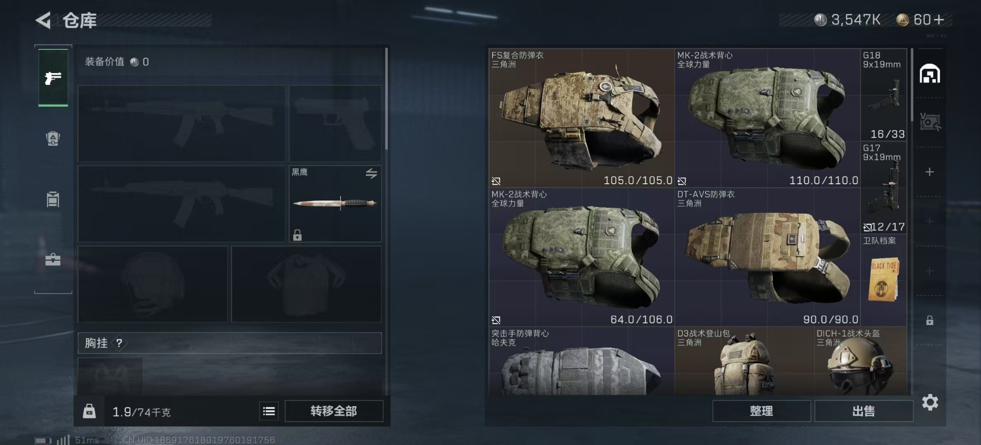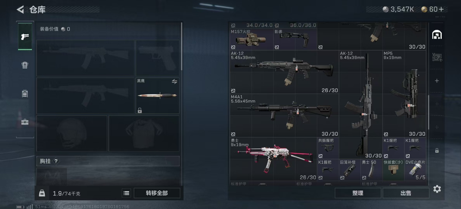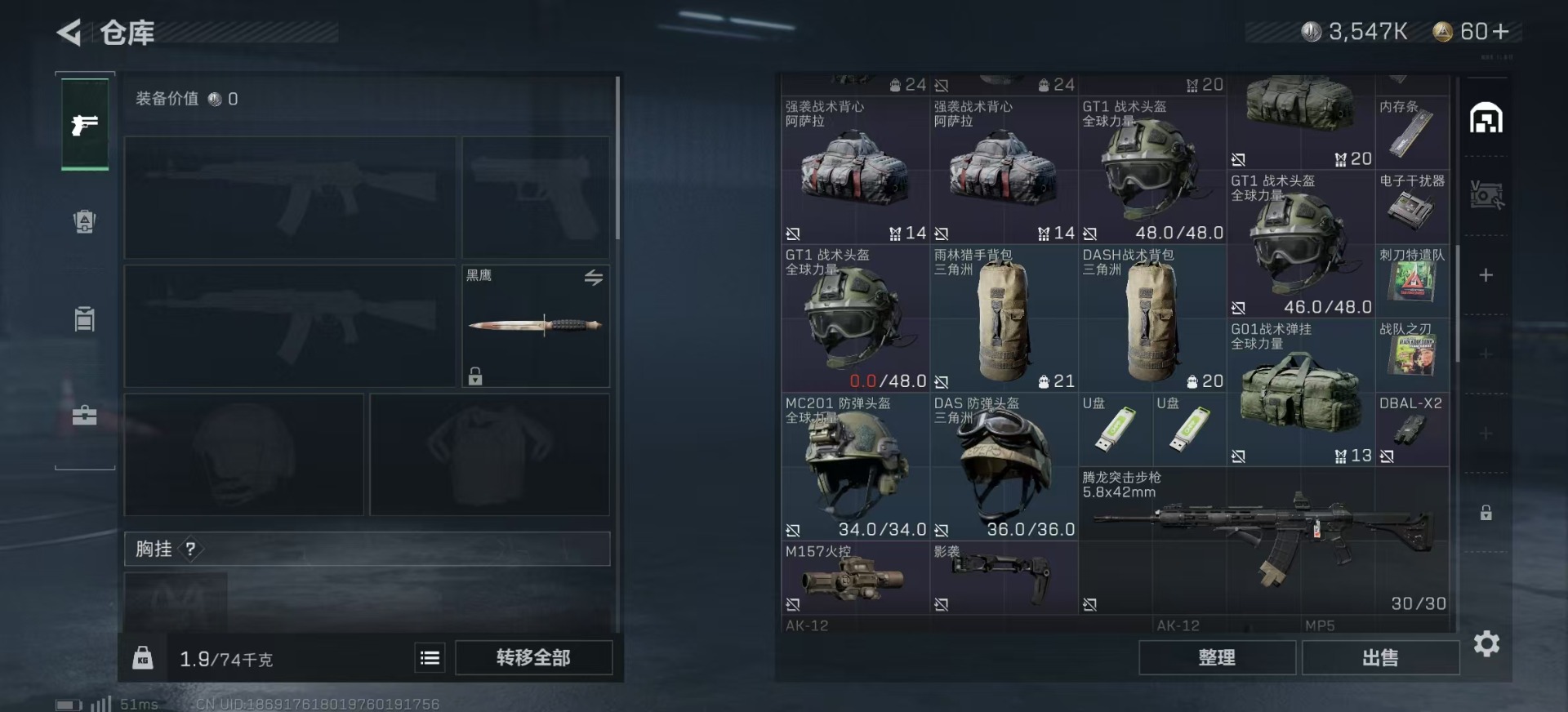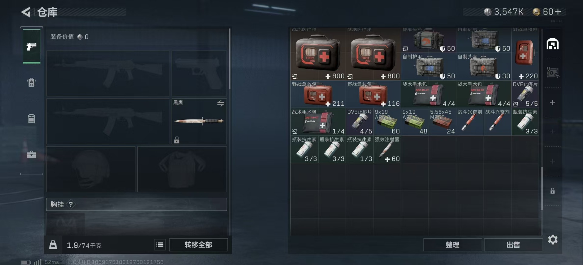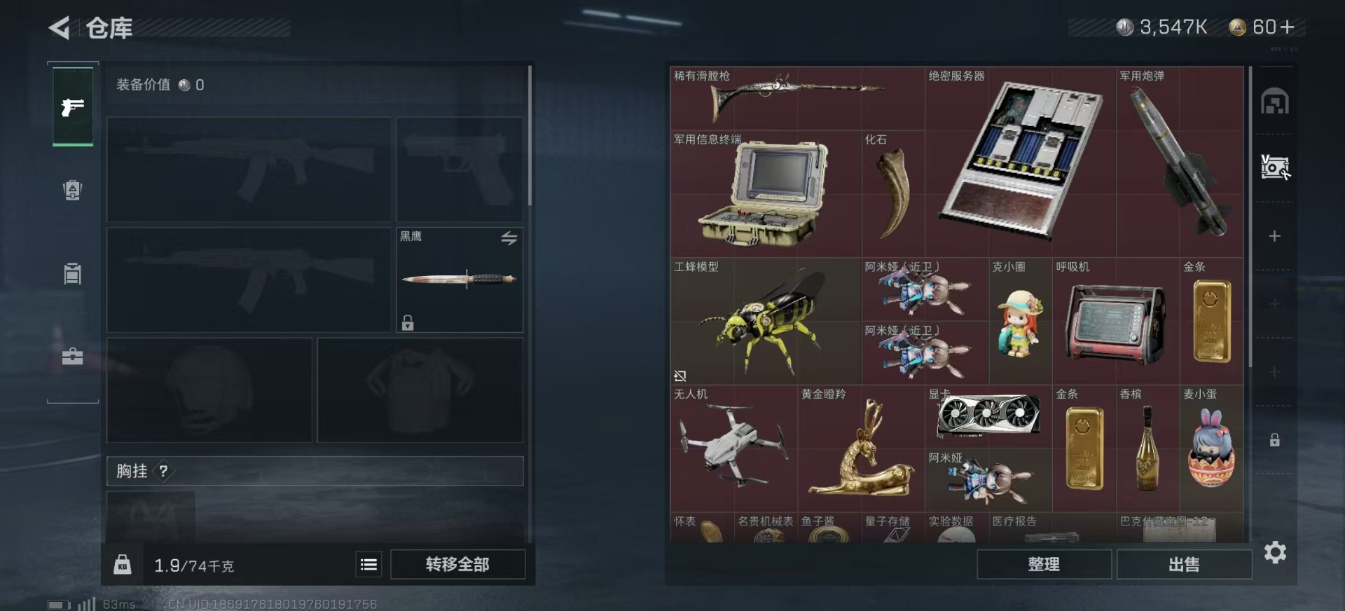 - [11879786]总资产:73.4M 3干员外观 12传说枪械 哈夫币:3.402K 高级安全箱(2×3)9.15号到期 可二次 可修改实名 安全保护中 烽火地带段位:黑鹰 全面战场段位:上等兵 传说武器皮肤:SR-25射手步枪-水墨云图,SCAR-H战斗步枪-水墨云图,AK-12突击步枪-夜鹰,SMG45冲锋枪-骑士,M4A1突击步枪-阿米娅,CAR-15突击步枪-阿米娅,复合弓-黑-天际线,AWM狙击步枪-捞点薯条,腾龙突击步枪-捞点薯条,93R-捞点薯条,勇士冲锋枪-能天使-午夜邮差,725双管霰弹枪-送葬人-无题密令 干员外观:骇爪-水墨云图,无名-夜鹰,蜂医-送葬人·无题密令(S5)