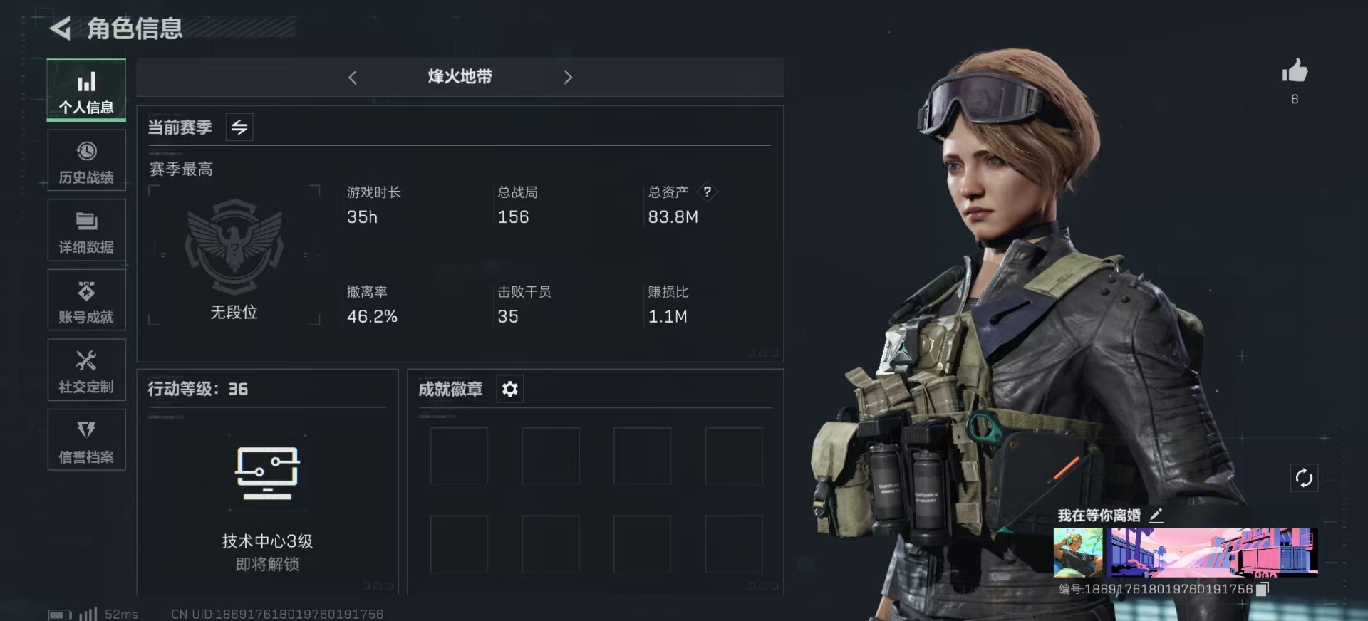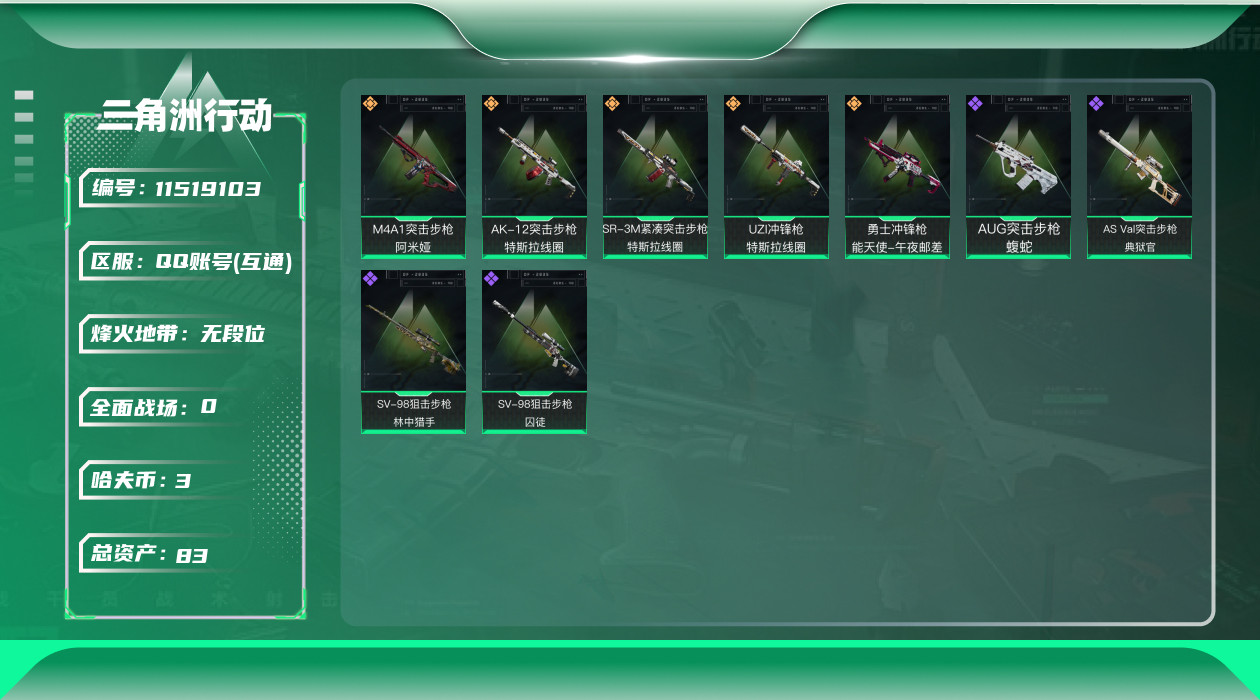 [11519103]总资产:83.3M 5传说枪械 哈夫币:3.547K 可二次 可修改实名 烽火地带段位:无段位 全面战场段位:无段位 传说武器皮肤:M4A1突击步枪-阿米娅,AK-12突击步枪-特斯拉线圈,SR-3M紧凑突击步枪-特斯拉线圈,UZI冲锋枪-特斯拉线圈,勇士冲锋枪-能天使-午夜邮差 史诗武器皮肤:AUG突击步枪-蝮蛇,SV-98狙击步枪-林中猎手,AS Val突击步枪-典狱官,SV-98狙击步枪-囚徒