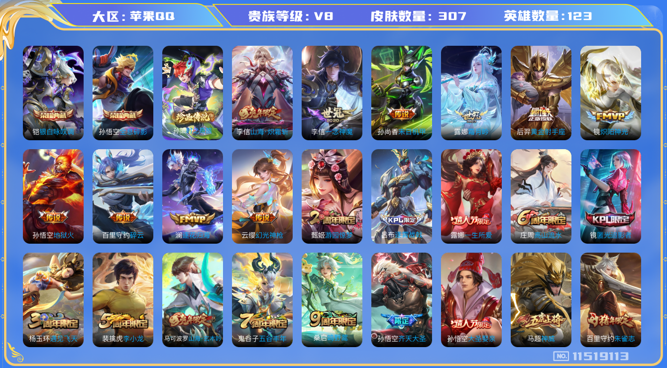 [11519113]V8 2典藏 1珍品传说 15传说 123英雄 307皮肤 可修改实名 优质装备:全息碎影(猴子典藏),银白咏叹调(倪克斯侍卫),黄金射手座,炽阳神光,一念神魔,末日机甲-孙尚香(绿蚂蚱),地狱火,碎云,山海·炽霜斩(李信年限),霜月吟,澜逐花归海 珍品传说:时之奇旅-孙策 传说皮:幻光神枪 珍宝阁皮:妄想食味,蔷薇恋人 限定皮:愿照·九州拓(澜年限),愿照·岁时盈(虞姬年限),逐霄战戟,鸣野蒿,神威(电光马子),遇见飞天,高山流水,齐天大圣,五谷丰年,游园惊梦,李小龙,朱雀志(守约年限),一生所爱,大圣娶亲,匿光追影者,山海·玄木吟(马可年限) 史诗皮:鸭鸭历险记-刘禅,狼魂孤将,绮世丹青,瑰影绮梦,化蝶舞,龙之律动,雪豹·霜爪,藏狐·褐绒,百相守梦-周瑜,茶境仙,百相守梦-百里守约,百相守梦-黄忠,紫霞仙子,苍穹之光,白龙吟,黄金分割率,特工魅影,匿光侦查者,江河有灵,蒙恬荣光圣徽,无限星赏官,冰冠公主,末日机甲-吕布,猫狗日记-大乔,乱世虎臣,节奏热浪,修罗,女仆咖啡,摇滚巨星,水果甜心,绅士熊喵,天才门将,星夜王子,心灵骇客,暗隐猎兽者,幽灵船长,鬼剑武藏,心灵战警,乐园奇幻夜,天秀·启明,舞动绿茵,地狱岩魂,纤云弄巧,拒霜思,缤纷独角兽,乘风破浪,逐浪之夏,水晶猎龙者,箭羽风息,金属风暴,圣诞恋歌,鹰眼统帅,暗夜贵公子,魅力维加斯,黎明之约,赏金猎手,奇遇舞章,无心,未来纪元-赵云