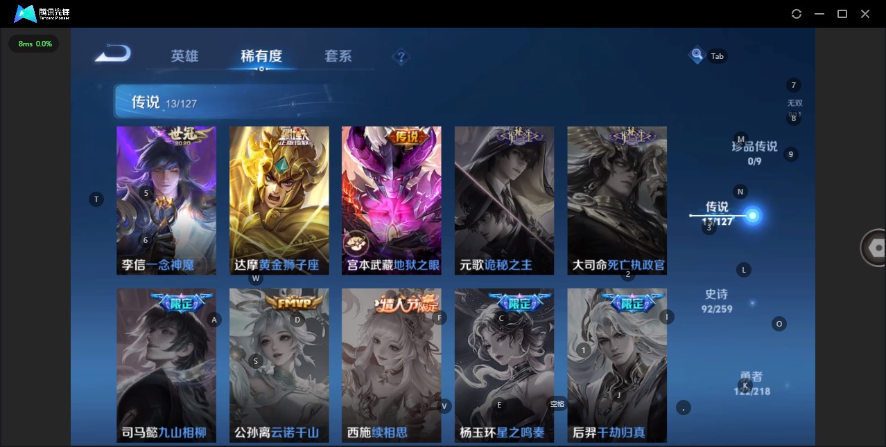 - [11227557]V7 1典藏 4传说 123英雄 260皮肤 可修改实名 荣耀水晶:鸣剑·曳影 传说皮:幻光神枪,黄金射手座,一念神魔 珍宝阁皮:优雅恋人,玩趣恶龙 限定皮:逐霄战戟,鸣野蒿,至尊宝,神威(电光马子),冰锋战神,梁祝,御风骁将(吕布年限),逐梦之星,李小龙,大圣娶亲 史诗皮:星界战将,龙之律动,蒙犽顽岩魄,化蝶舞,紫霞仙子,白龙吟,黄金分割率,特工魅影,江河有灵,高渐离燃音魔法,百解令(蒙犽),蒙恬荣光圣徽,无限星赏官,末日机甲-吕布,猫狗日记-孙策,猫狗日记-大乔,节奏热浪,摇滚巨星,水果甜心,绅士熊喵,天才门将,星夜王子,心灵骇客,德古拉伯爵,暗隐猎兽者,幽灵船长,鬼剑武藏,心灵战警,地狱岩魂,纤云弄巧,繁星吟游(呼啦呼啦),拒霜思,乘风破浪,逐浪之夏,水晶猎龙者,曙光守护者,金属风暴,原初追逐者,圣诞狂欢,圣诞恋歌,鹰眼统帅,魅力维加斯,未来纪元-赵云