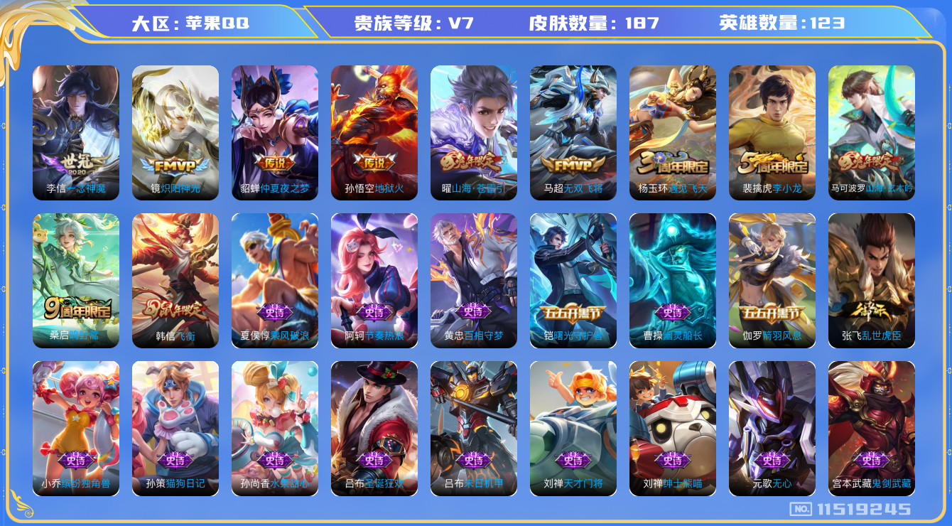 - PX_2090069-实名: 可修改 贵族等级: V4 英雄数: 119 皮肤数: 116 传说皮: 超时空战士-狄仁杰 限定皮: 五谷丰年,鸣野蒿,逐霄战戟