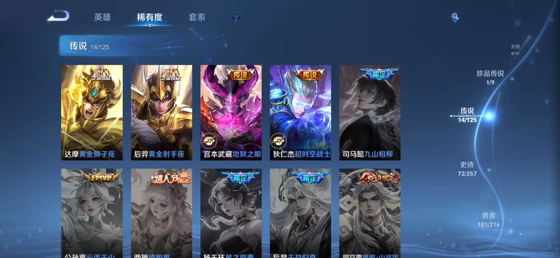 - [11768404]V8 1典藏 14传说 125英雄 275皮肤 可修改实名 优质装备:弑枪猎影(韩信典藏),黄金狮子座,云鹰飞将(小将军),黄金白羊座,炽阳神光,地狱火,仲夏夜之梦(大飞蛾),胖达荣荣,无双飞将 传说皮:祥瑞亨通 珍宝阁皮:玩趣恶龙 限定皮:至尊宝,凤求凰(白切鸡),魔法小厨娘,时雨天司(水龙头),遇见飞天,诗剑行,怒海麟威,梁祝,天狼狩猎者,李小龙,如梦令-嫦娥,如梦令-后羿,大圣娶亲,玉兔公主 史诗皮:鸭鸭历险记-刘禅,化蝶舞,龙之律动,茶境仙,怒海争锋,破空之剑,芈月浮光幕影,蔬乡物语(鲁班七号),紫霞仙子,电玩小子(小书包),白龙吟,黄金分割率,特工魅影,千年之狐,江河有灵,鹤归松栖(赵怀真),高渐离燃音魔法,蒙恬荣光圣徽,冰冠公主,偶像歌手,晚萤,电玩·爆裂旋风,龙骑士(小龙虾),末日机甲-吕布,猫狗日记-孙策,猫狗日记-大乔,乱世虎臣,节奏热浪,女仆咖啡,摇滚巨星,水果甜心,星夜王子,功夫厨神,德古拉伯爵,暗隐猎兽者,幽灵船长,鬼剑武藏,心灵战警,天秀·启明,舞动绿茵,地狱岩魂,纤云弄巧,繁星吟游(呼啦呼啦),缤纷独角兽,乘风破浪,逐浪之夏,月团寄思,水晶猎龙者,曙光守护者,金属风暴,原初追逐者,圣诞狂欢,圣诞恋歌,鹰眼统帅,魅力维加斯,赏金猎手,未来纪元-赵云