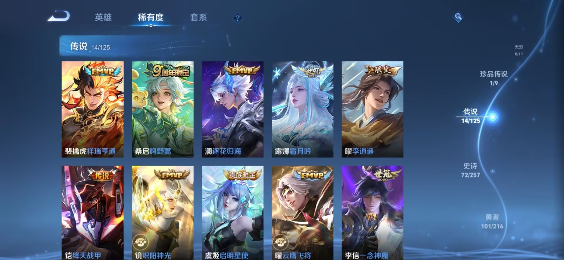 - [11853459]V7 1典藏 5传说 124英雄 162皮肤 可修改实名 优质装备:鸣剑·曳影,地狱火,超时空战士-狄仁杰,鹤羽星尊,玄雷天君 珍宝阁皮:蔷薇恋人 限定皮:五谷丰年,武圣,梁祝,李小龙,猪悟能 史诗皮:化蝶舞,龙之律动,百相守梦-周瑜,茶境仙,百相守梦-黄忠,电玩小子(小书包),黄金分割率,特工魅影,千年之狐,江河有灵,魅语,高渐离燃音魔法,冰冠公主,末日机甲-吕布,节奏热浪,水果甜心,绅士熊喵,天才门将,星夜王子,心灵骇客,功夫厨神,暗隐猎兽者,鬼剑武藏,缤纷独角兽,水晶猎龙者,曙光守护者,金属风暴,圣诞狂欢,圣诞恋歌,鹰眼统帅,暗夜贵公子,魅力维加斯,未来纪元-赵云