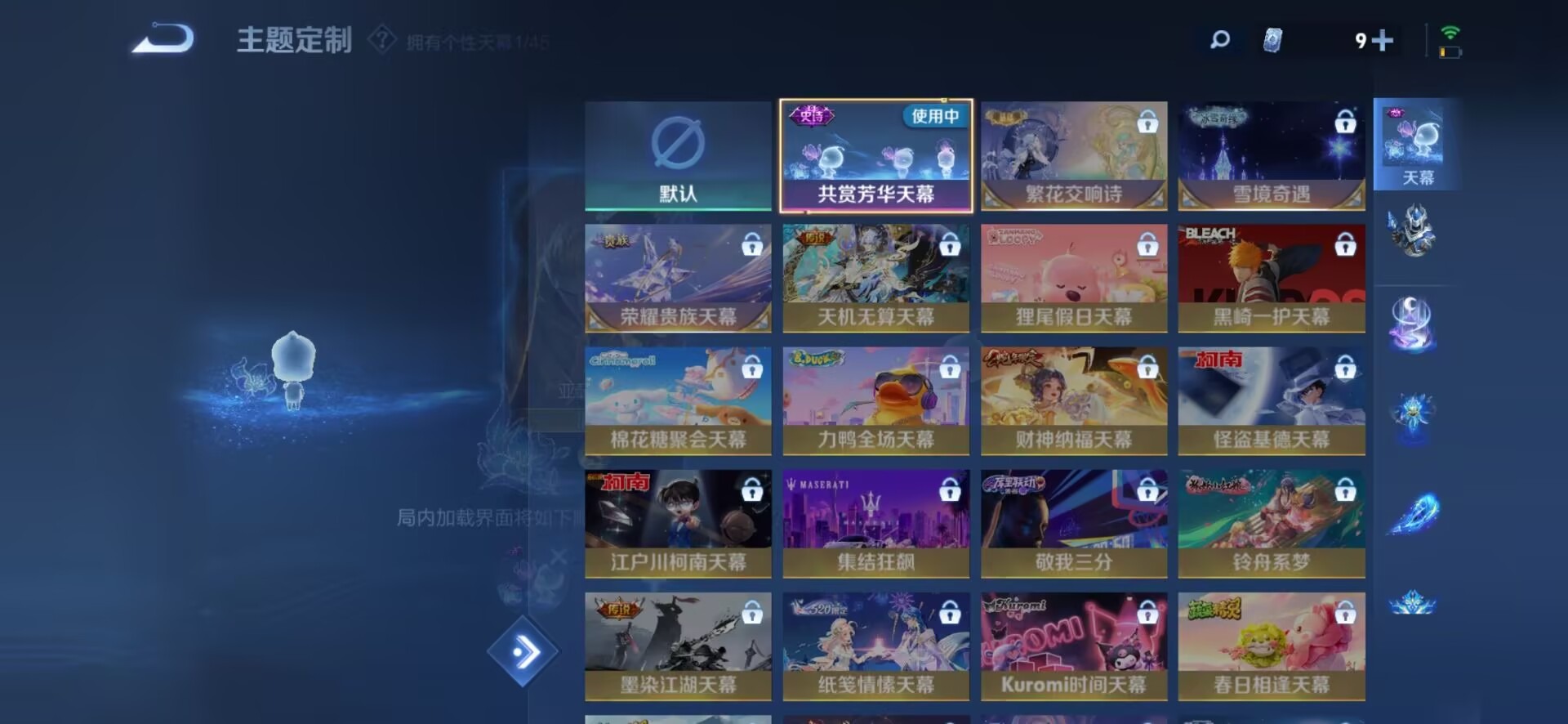 大乔猫狗日记,刘邦德古拉伯爵,夏侯惇乘风破浪,阿轲暗夜猫娘,阿轲节奏热浪,铠曙光守护者,曹操幽灵船长,伽罗箭羽风息,廉颇地狱岩魂,小乔缤纷独角兽,孙策猫狗日记,鲁班七号电玩小子,吕布圣诞狂欢,吕布末日机甲,诸葛亮黄金分割率,司马懿暗渊魔法,刘禅天才门将,宫本武藏鬼剑武藏,公孙离无限星赏官,兰陵王暗隐猎兽者,貂蝉圣诞恋歌,花木兰水晶猎龙者,李白千年之狐,安琪拉心灵骇客,艾琳奇遇舞章,白起星夜王子,亚瑟心灵战警,嬴政摇滚巨星,嬴政暗夜贵公子,程咬金功夫厨神,百里玄策原初追逐者,雅典娜黎明之约,百里守约特工魅影,李元芳逐浪之夏,墨子龙骑士,墨子金属风暴,蔡文姬舞动绿茵,澜赏金猎手,娜可露露晚萤,王昭君偶像歌手,橘右京修罗