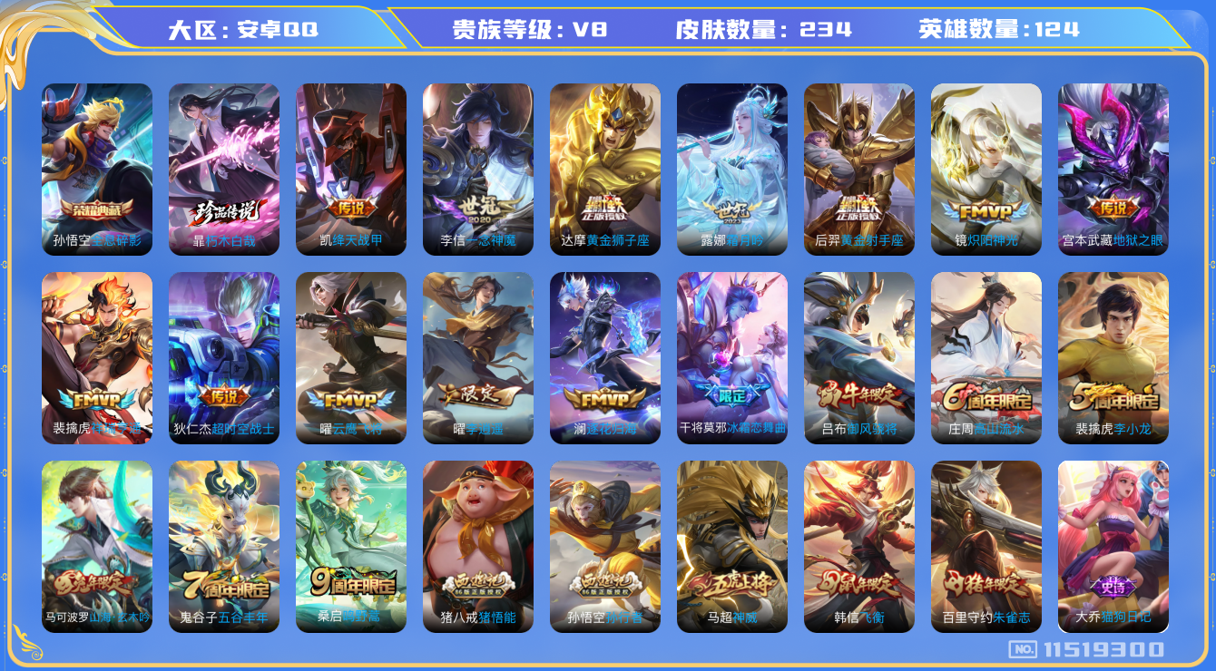 [11519300]V8 1典藏 1珍品传说 14传说 124英雄 234皮肤 可修改实名 荣耀水晶:全息碎影(猴子典藏) 珍品传说:朽木白哉 传说皮:祥瑞亨通,李逍遥,黄金狮子座,黄金射手座,地狱之眼,一念神魔,云鹰飞将(小将军),炽阳神光,绛天战甲(鸡嘴战神),超时空战士-狄仁杰,霜月吟,澜逐花归海 珍宝阁皮:万物之道,女武神,玩趣恶龙 限定皮:鸣野蒿,神威(电光马子),飞衡(韩信年限),高山流水,五谷丰年,御风骁将(吕布年限),李小龙,朱雀志(守约年限),孙行者,猪悟能,冰霜恋舞曲,山海·玄木吟(马可年限) 史诗皮:赞萌露比,鸭鸭历险记-刘禅,龙之律动,石田雨龙,百相守梦-黄忠,百相守梦-周瑜,化蝶舞,电玩小子(小书包),黄金分割率,特工魅影,千年之狐,蒙恬荣光圣徽,偶像歌手,晚萤,无限星赏官,暗夜猫娘,龙骑士(小龙虾),末日机甲-吕布,猫狗日记-孙策,猫狗日记-大乔,乱世虎臣,节奏热浪,修罗,摇滚巨星,水果甜心,天才门将,星夜王子,心灵骇客,功夫厨神,德古拉伯爵,暗隐猎兽者,幽灵船长,鬼剑武藏,暗渊魔法,心灵战警,舞动绿茵,地狱岩魂,缤纷独角兽,乘风破浪,逐浪之夏,水晶猎龙者,曙光守护者,箭羽风息,金属风暴,原初追逐者,圣诞狂欢,圣诞恋歌,鹰眼统帅,暗夜贵公子,黎明之约,赏金猎手,奇遇舞章,无心,未来纪元-赵云