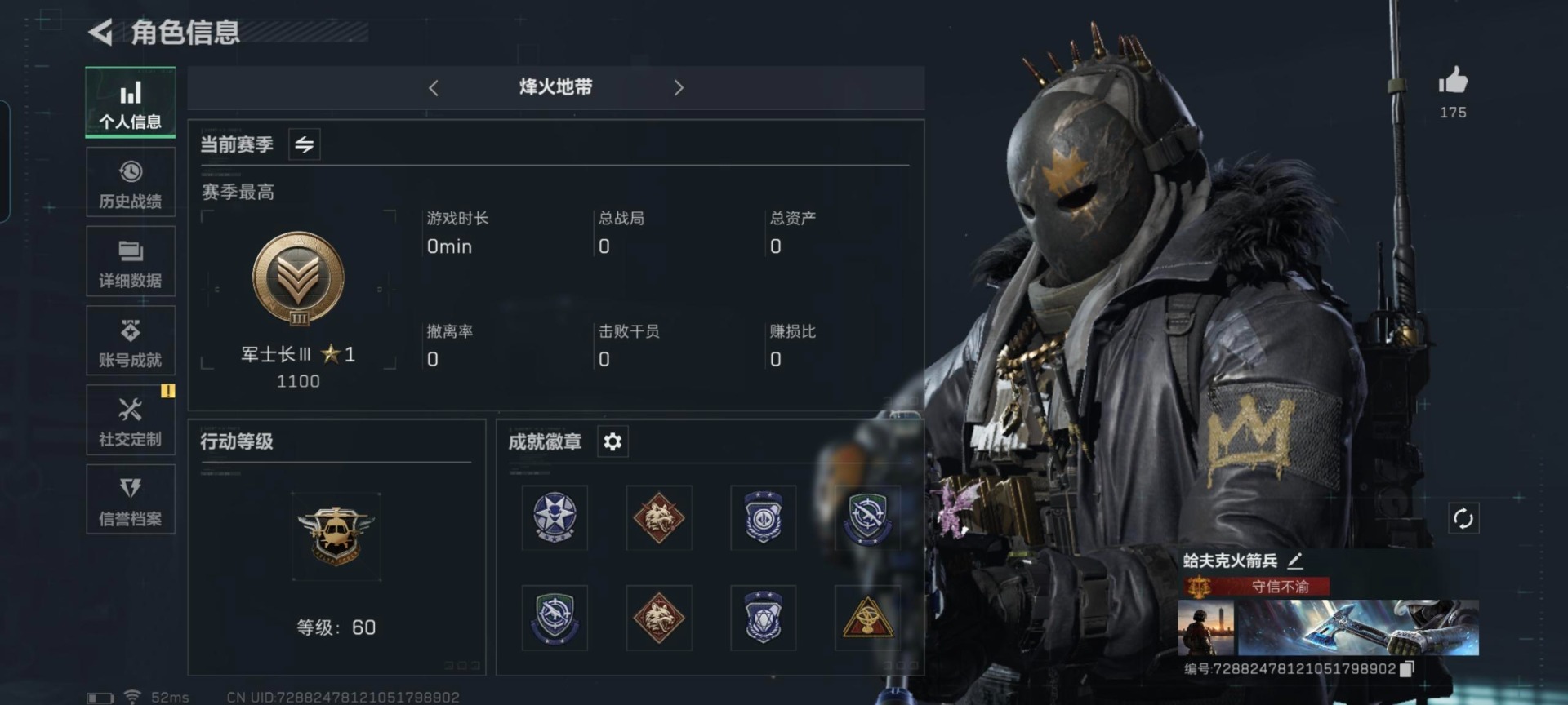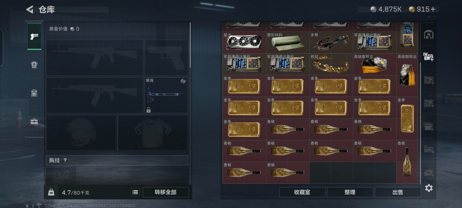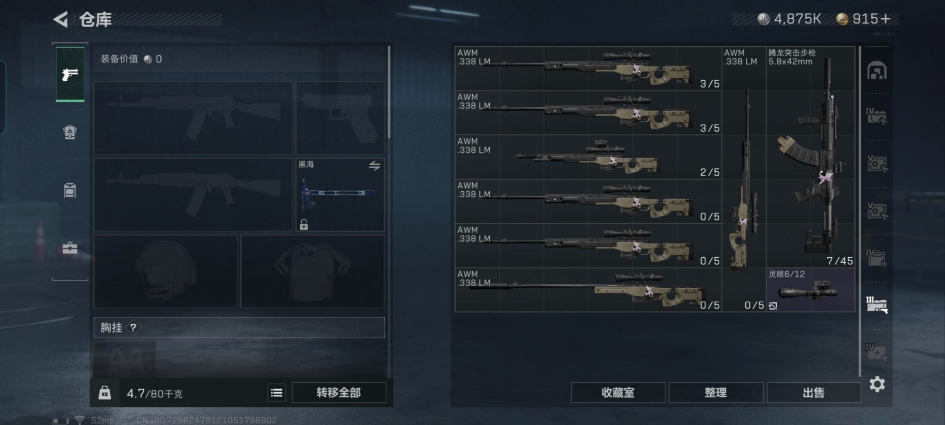 [11519285]总资产:307.5 2干员外观 1近战传说 13传说枪械 可二次 可修改实名 烽火地带段位:黑鹰 全面战场段位:军士长 哈夫币:4.875 传说武器皮肤:近战-黑海,AS Val突击步枪-蛇年祥瑞,SR-25射手步枪-水墨云图,SCAR-H战斗步枪-铁艺苍穹,AK-12突击步枪-夜鹰,SMG45冲锋枪-骑士,QJB201轻机枪-黑海,MP5冲锋枪-黑海,M7战斗步枪-维京,M4A1突击步枪-蚀金玫瑰,P90冲锋枪-神秘艺术,QBZ95-1突击步枪-破军,M7战斗步枪-神秘艺术 干员外观:红狼-蚀金玫瑰,牧羊人-街头之王