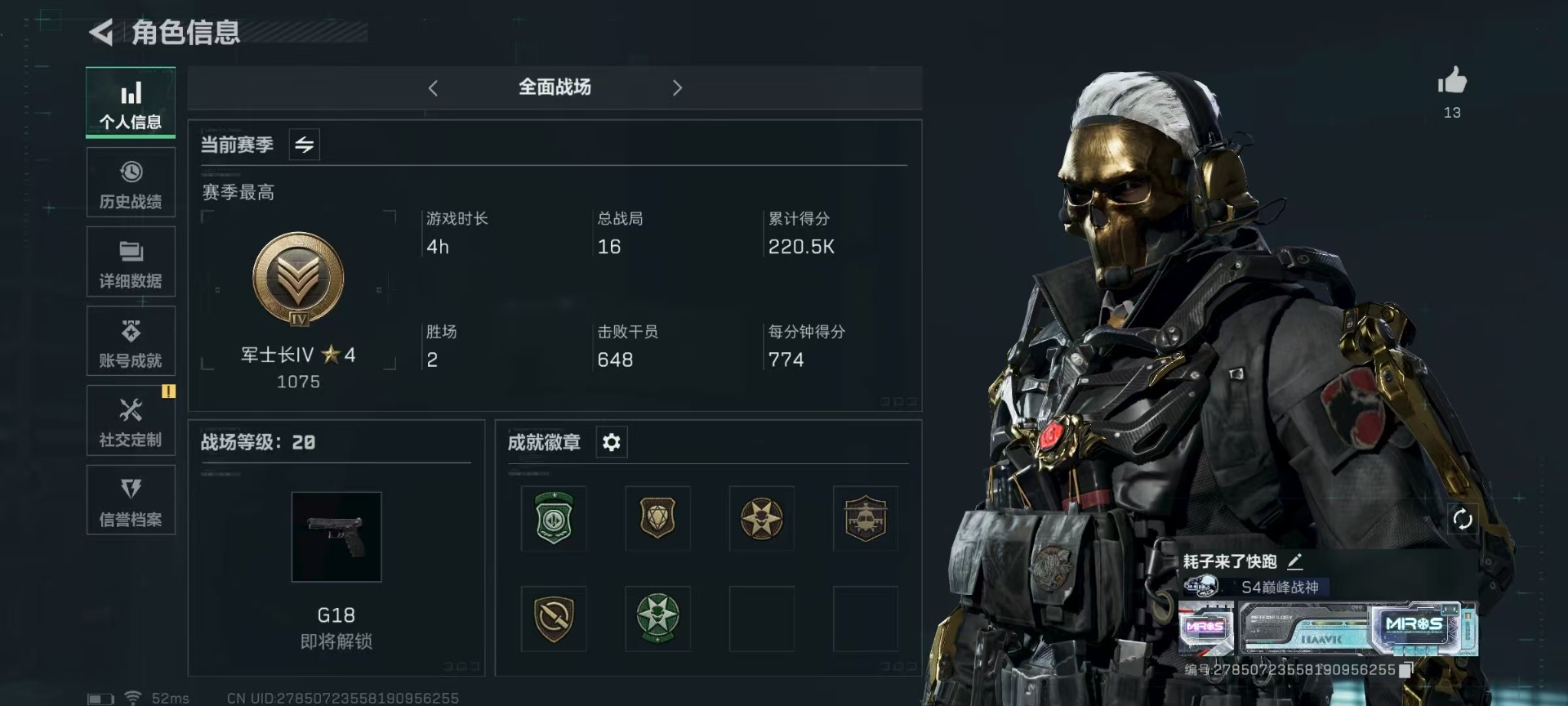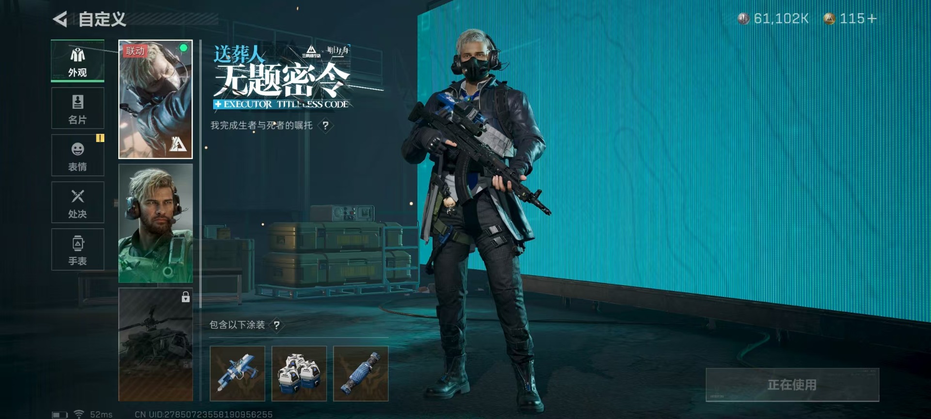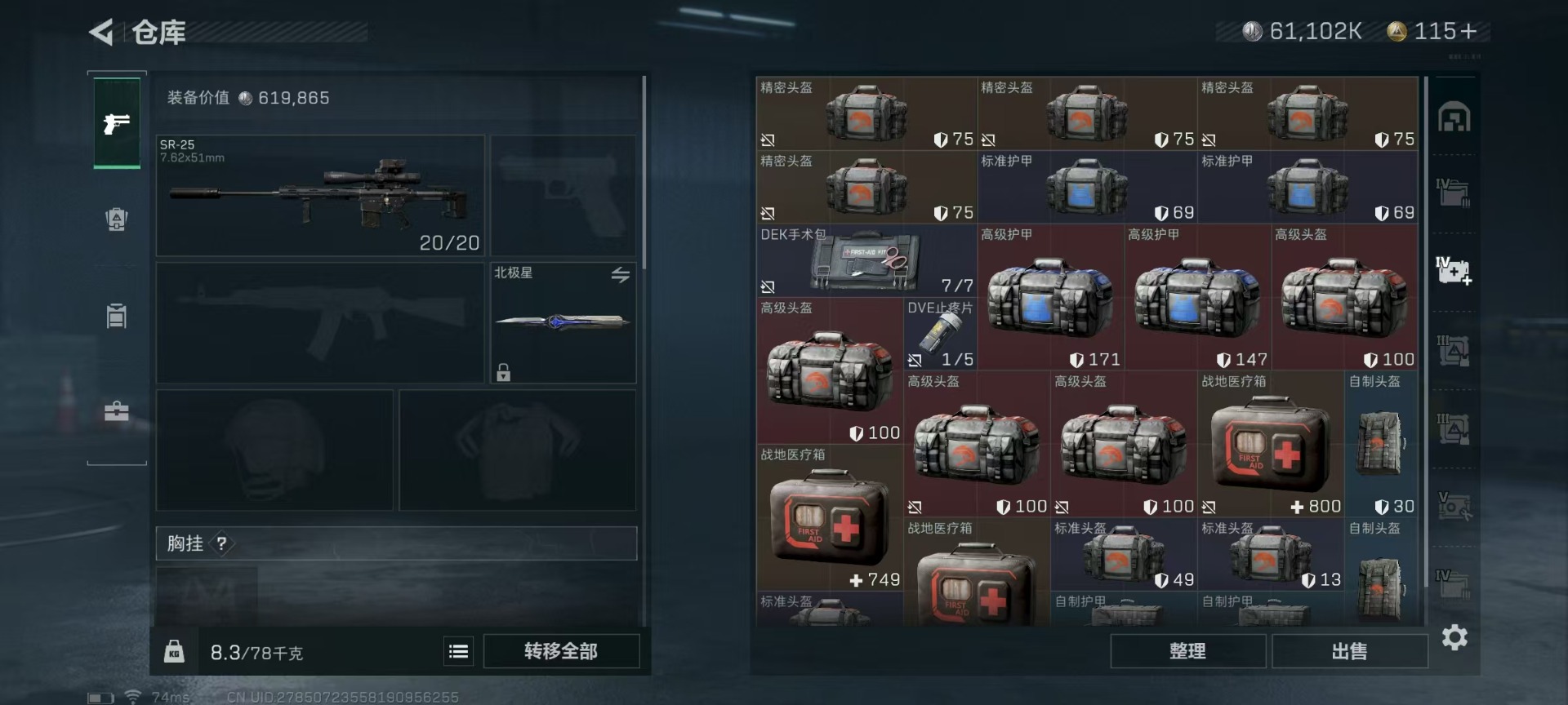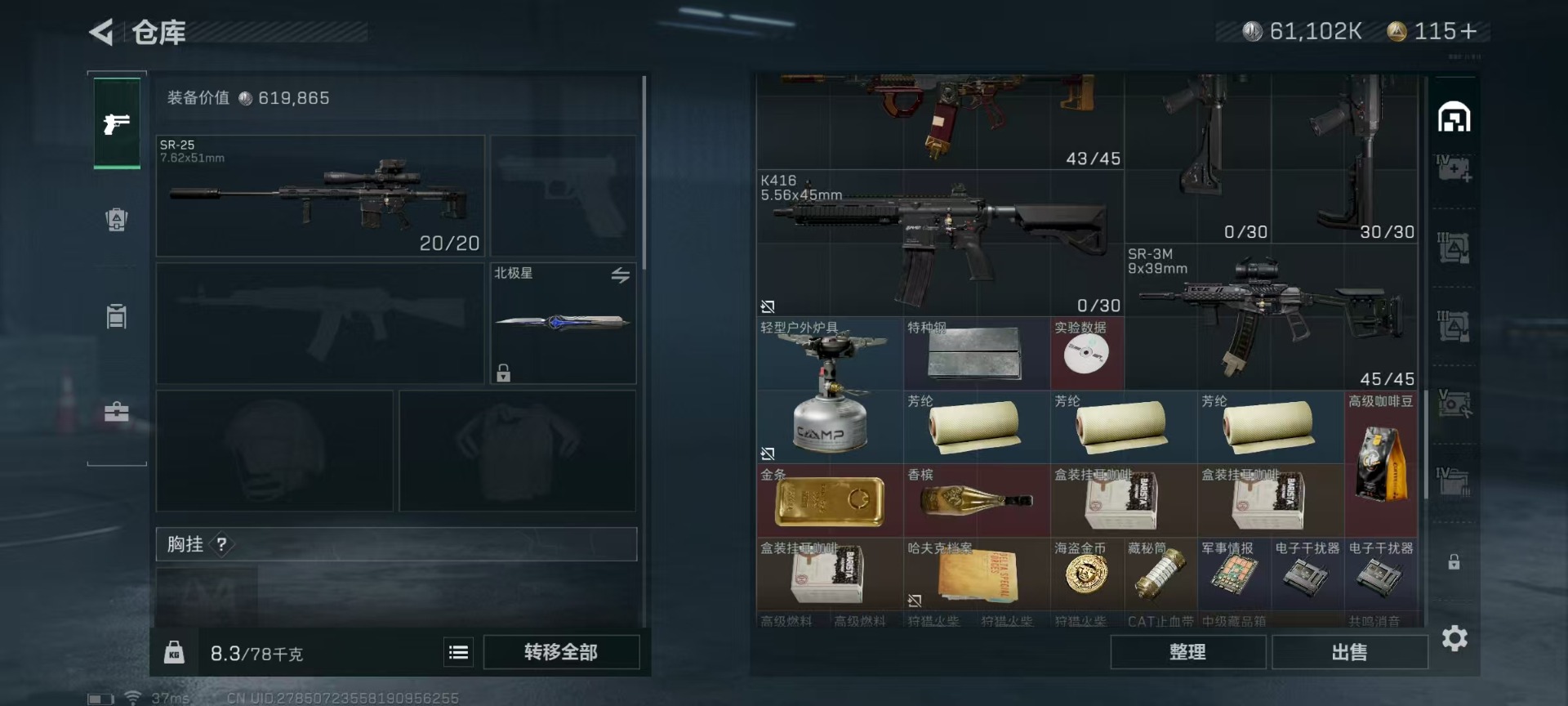 [11519398]总资产:107.3 1干员外观 3传说枪械 可二次 可修改实名 烽火地带段位:无段位 全面战场段位:无段位 哈夫币:7.301 传说武器皮肤:AK-12突击步枪-夜鹰,复合弓-黑-天际线,725双管霰弹枪-送葬人-无题密令 史诗武器皮肤:SR-25射手步枪-尖端治疗,MP5冲锋枪-深海恐惧,SR-3M紧凑突击步枪-荒野求生,勇士冲锋枪-深海恐惧,AKM突击步枪-林中猎手,.357左轮-幸运时刻,SVD狙击步枪-暗夜猎手,M16A4突击步枪-竞赛选手,M1014霰弹枪-林中猎手,SV-98狙击步枪-林中猎手,PTR-32突击步枪-英雄,PSG-1射手步枪-无垢,M250通用机枪-囚徒,SV-98狙击步枪-囚徒,S12K霰弹枪-曙光,M14射手步枪-黑鹰坠落 干员外观:露娜-黑·天际线