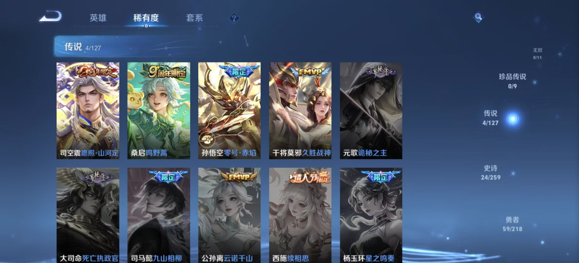 - PX_2053878-安卓Q 【可二次】 英雄数量:126 皮肤数量:656 贵族等级:贵族V10 【星传说 苍灵仙君 乞巧织春 无限倾慕 玉鸾呤 时之愿境 时之思念 幻海之心 星际治安官 未来机甲 金色仲夏夜】无双限定9 荣耀典藏14 珍品传说6 传说品质110 史诗品质211武则天 花合斗 离恨烟 韩信群星魔术团 甄姬雪境奇遇 青丘·九尾 真我赫兹瑶 碎月剑心 时之魔女 神器·明辉仪 幻阙歌