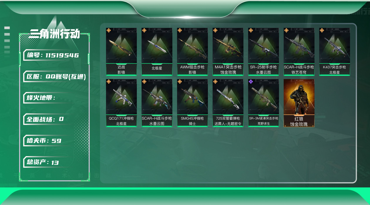 [11519546]可二次 可修改实名 实名:可修改 高级安全箱(2×3)9.15号到期 总资产:13.7 哈夫币:59.470 传说武器皮肤:近战-影锋,近战-北极星,SCAR-H战斗步枪-水墨云图,SR-25射手步枪-水墨云图,AWM狙击步枪-影锋,SCAR-H战斗步枪-铁艺苍穹,SMG45冲锋枪-骑士,725双管霰弹枪-送葬人-无题密令,QCQ171冲锋枪-北极星,K437突击步枪-北极星,M4A1突击步枪-蚀金玫瑰 史诗武器皮肤:SR-3M紧凑突击步枪-荒野求生 干员外观:红狼-蚀金玫瑰