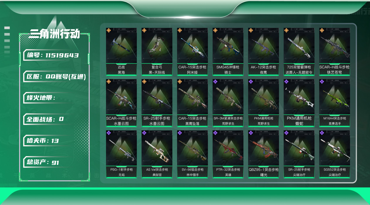 [11519643]可二次 可修改实名 实名:可修改 顶级安全箱(3×3)9.15号到期 总资产:91.1 哈夫币:13.245 传说武器皮肤:近战-黑海,SCAR-H战斗步枪-水墨云图,SR-25射手步枪-水墨云图,SCAR-H战斗步枪-铁艺苍穹,AK-12突击步枪-夜鹰,SMG45冲锋枪-骑士,复合弓-黑-天际线,CAR-15突击步枪-阿米娅,725双管霰弹枪-送葬人-无题密令,CAR-15突击步枪-黑鹰坠落 史诗武器皮肤:PKM通用机枪-蝮蛇,SR-25射手步枪-尖端治疗,PKM通用机枪-荒野求生,M700狙击步枪-守夜人,SG552突击步枪-尖端治疗,Ash-12战斗步枪-守夜人,SR-3M紧凑突击步枪-荒野求生,M16A4突击步枪-竞赛选手,SV-98狙击步枪-林中猎手,PTR-32突击步枪-英雄,PSG-1射手步枪-无垢,AS Val突击步枪-典狱官,QBZ95-1突击步枪-曙光,S12K霰弹枪-曙光 干员外观:骇爪-水墨云图,无名-夜鹰
