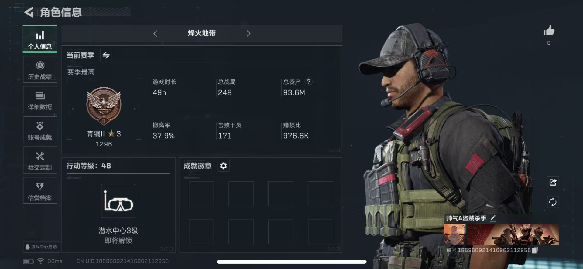 [11519655]总资产:93.6 6传说枪械 进阶安全箱(2×2)9.15号到期 可二次 可修改实名 烽火地带段位:青铜 全面战场段位:无段位 哈夫币:5.524 传说武器皮肤:M4A1突击步枪-阿米娅,CAR-15突击步枪-阿米娅,AWM狙击步枪-捞点薯条,腾龙突击步枪-捞点薯条,93R-捞点薯条,勇士冲锋枪-能天使-午夜邮差 史诗武器皮肤:SV-98狙击步枪-林中猎手,沙漠之鹰-曙光
