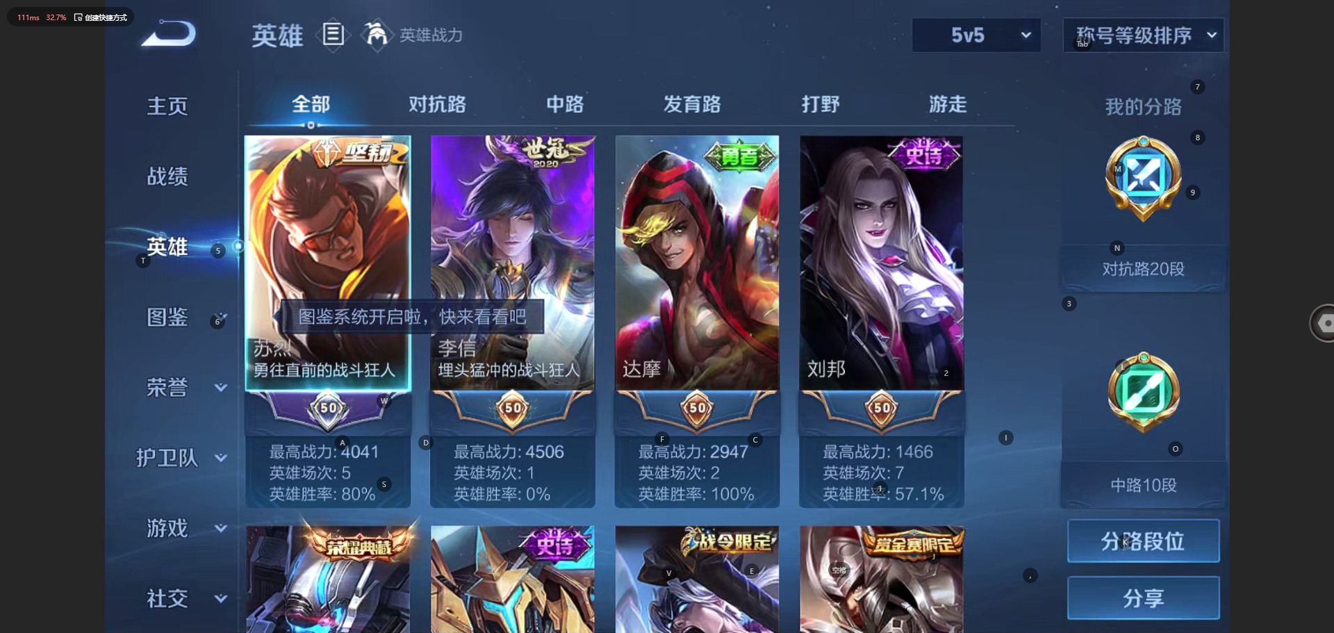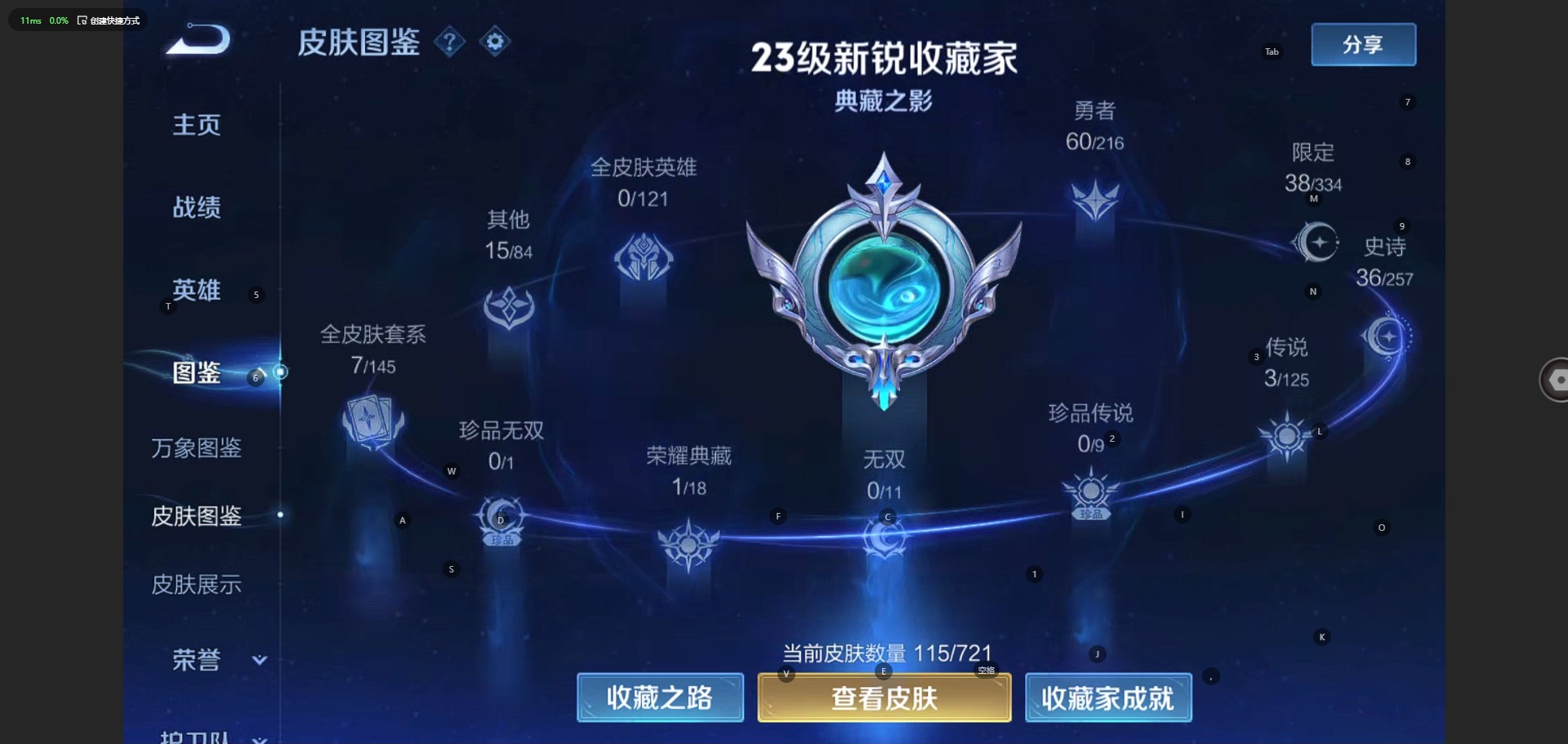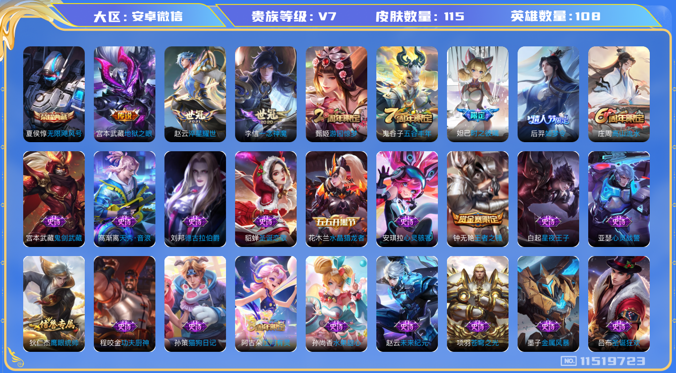 [11519723]V7 1典藏 3传说 108英雄 115皮肤 可修改实名 女号 安全保护中 荣耀水晶:无限飓风号(高达) 传说皮:地狱之眼,一念神魔,淬星耀世 珍宝阁皮:胡桃夹子,玩趣恶龙 限定皮:时之彼端,高山流水,五谷丰年,游园惊梦,如梦令-后羿 史诗皮:苍穹之光,江河有灵,末日机甲-吕布,猫狗日记-孙策,女仆咖啡,水果甜心,天才门将,星夜王子,心灵骇客,功夫厨神,德古拉伯爵,鬼剑武藏,心灵战警,水晶猎龙者,金属风暴,圣诞狂欢,圣诞恋歌,鹰眼统帅,王者之锤,魅力维加斯,天秀·音浪,无心,未来纪元-赵云