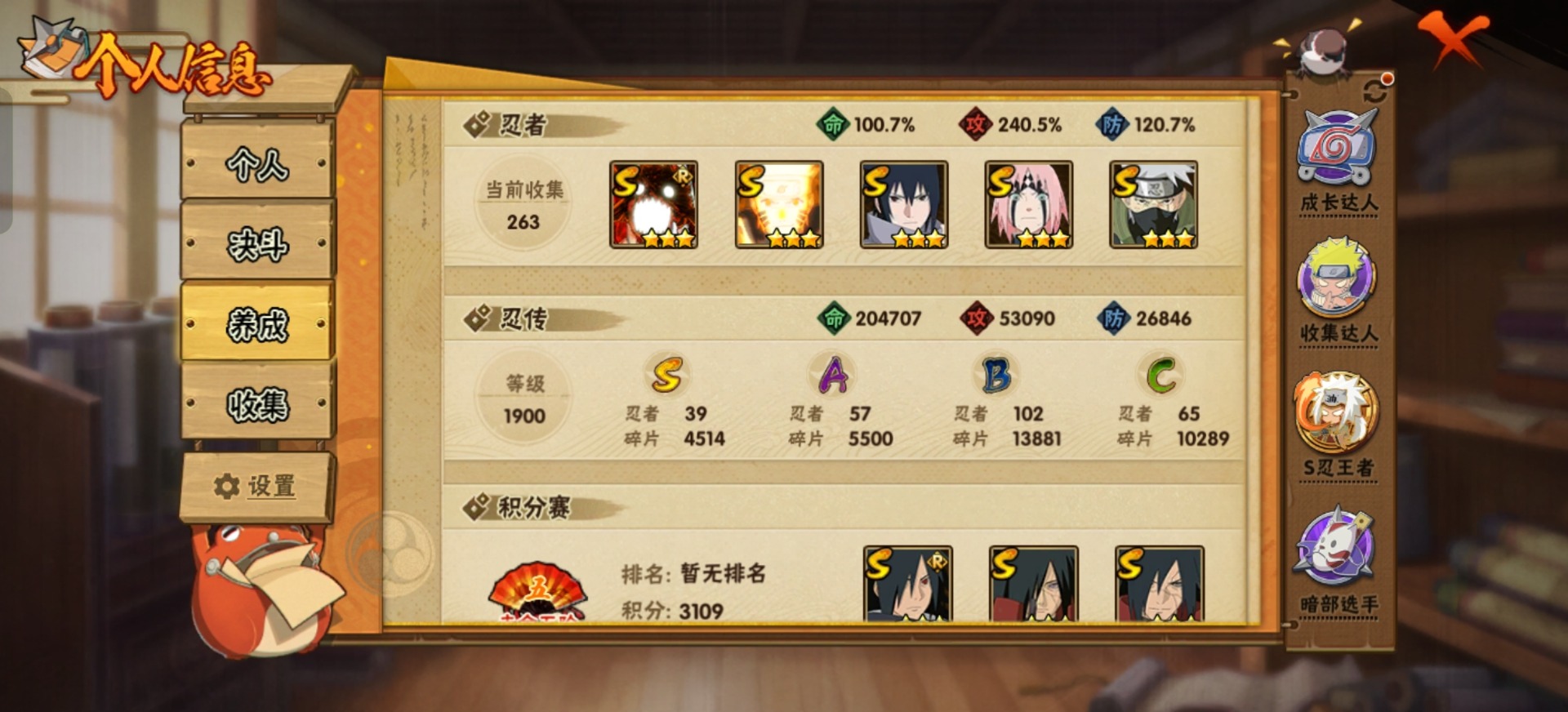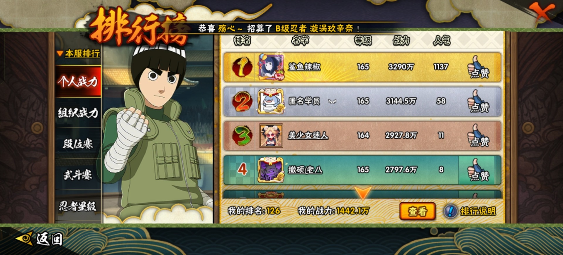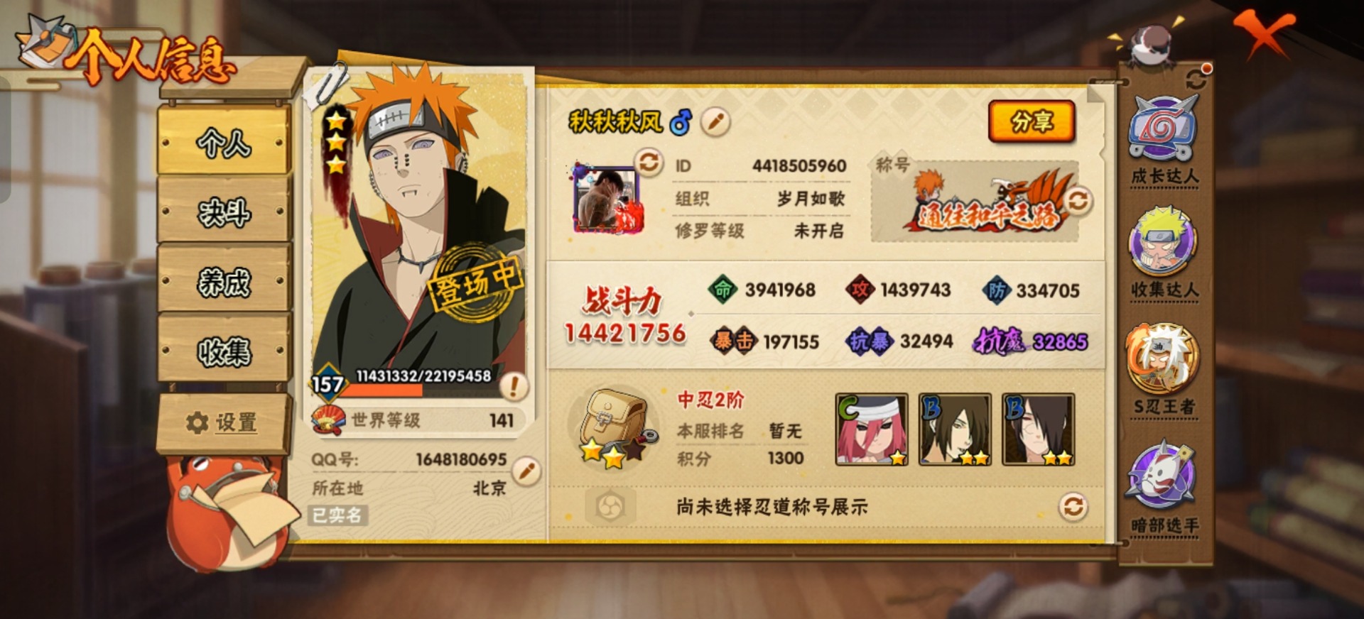 [11519822]V13 39S忍 50A忍 26通灵 1442.1W战力 可二次 可修改实名 优质装备:熊猫,千手柱间「秽土转生」,罗砂「四代目风影」,宇智波鼬「秽土转生」,佩恩·天道「超」,药师兜「仙人模式」,宇智波斑「秽土转生」,艾「三代目雷影」,宇智波斑 「木叶创立」,半藏「秽土转生」,千手扉间「秽土转生」,波风水门「秽土转生」,猿飞日斩「秽土转生」,长门「秽土转生」,迈特凯「死门」,宇智波带土 「忍界大战」,“宇智波斑” 「白面具」,漩涡鸣人 「九喇嘛连结」,大筒木金式「博人传」,春野樱 「忍界大战」,神秘面具男 「红夜之刃」,宇智波佐助「永恒万花筒」,千手柱间·木叶创立,宇智波斑「秽土转生·解」,大筒木桃式,艾「忍界大战」,宇智波止水「须佐能乎」,旗木卡卡西「须佐能乎」,大筒木舍人 「最终章」,自来也 「传说中的三忍」,漩涡鸣人 「暴怒·第六尾」 S级忍者:大野木 「忍界大战」,自来也 「舞之豪杰」,宇智波鼬 「须佐能乎」,佩恩「天道」,猿飞日斩,波风水门,大蛇丸,自来也,纲手