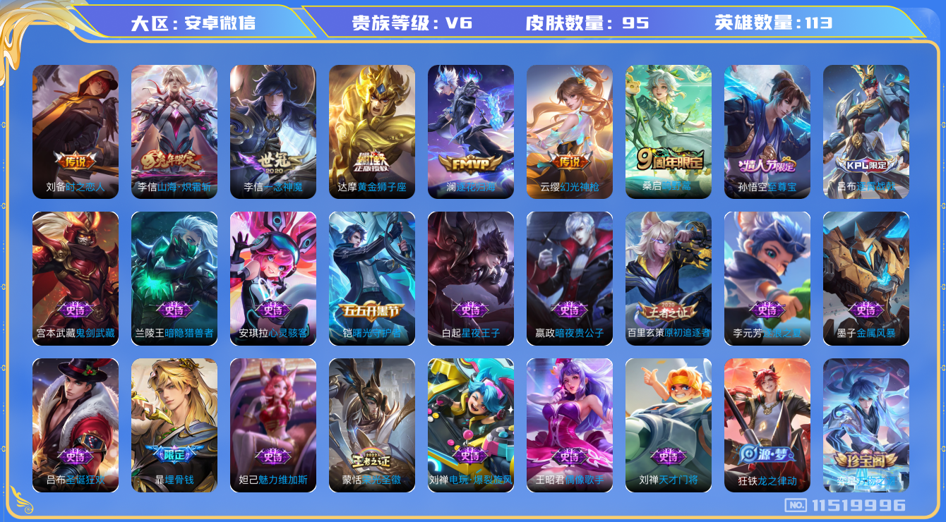 [11519996]V6 7传说 113英雄 95皮肤 可修改实名 优质装备:黄金狮子座,一念神魔,时之恋人-刘备(电焊工),山海·炽霜斩(李信年限),澜逐花归海 传说皮:幻光神枪 珍宝阁皮:万物之道 限定皮:逐霄战戟,鸣野蒿,至尊宝 史诗皮:龙之律动,埋骨钱,电玩·爆裂旋风,蒙恬荣光圣徽,偶像歌手,天才门将,星夜王子,心灵骇客,暗隐猎兽者,鬼剑武藏,逐浪之夏,曙光守护者,金属风暴,原初追逐者,圣诞狂欢,暗夜贵公子,魅力维加斯