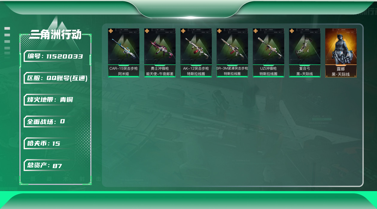 [11520033]总资产:87.1 1干员外观 6传说枪械 进阶安全箱(2×2)9.15号到期 可二次 可修改实名 烽火地带段位:青铜 全面战场段位:无段位 哈夫币:15.084 传说武器皮肤:CAR-15突击步枪-阿米娅,复合弓-黑-天际线,AK-12突击步枪-特斯拉线圈,SR-3M紧凑突击步枪-特斯拉线圈,UZI冲锋枪-特斯拉线圈,勇士冲锋枪-能天使-午夜邮差 干员外观:露娜-黑·天际线