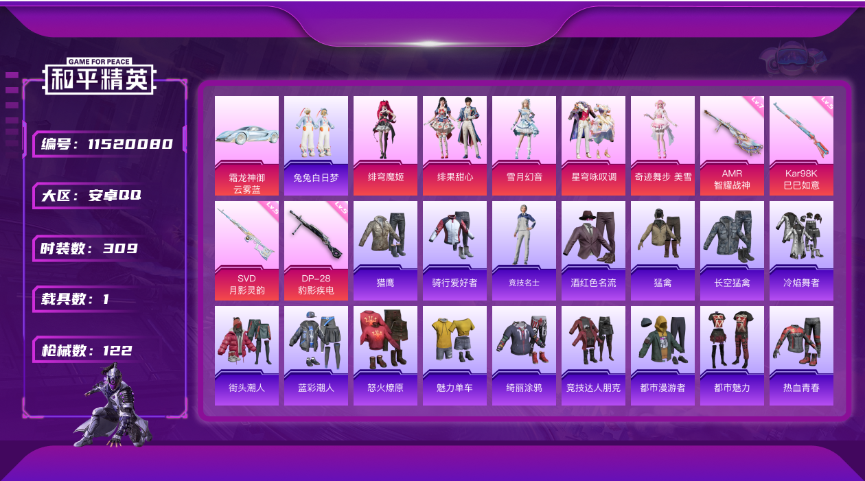 [11520080]5粉装 4特效枪 1载具 4印记 可二次 可修改实名 热门装扮:奇迹舞步-美雪,雪月幻音,绯穹魔姬,绯果甜心,星穹咏叹调,兔兔白日梦 载具:霜龙神御(云雾蓝) 稀有枪皮:AMR-智耀战神,SVD-月影灵韵,Kar98K-巳巳如意 七级特效枪:七级AMR-智耀战神 五级特效枪:五级SVD-月影灵韵,五级Kar98K-巳巳如意,五级DP-28-豹影疾电 紫色装扮:SS22特训,SS23特训,SS21特训,SS30特训套装,冷焰舞者,极速光影,SS31特训套装,云朵鹅,雪绒豹,SS33特训套装,顶瓜瓜,混沌火种,SS14特训,豚鼠丹丹,SS17特训,长空猛禽,都市漫游者,都市魅力,酒红色名流,金鼠迎春,缤纷果语,蓝彩潮人,街头潮人,蓝海鲸歌,龙的传人,骑行爱好者,魅力单车,麻辣教官,香桃花海,绮丽涂鸦,柠萌假日,怒火燎原,甜蜜熊情侣,破蛋小黄鸡,王牌教练,福星高照,竞技达人朋克,猛禽,热血青春,牛气冲天,猎鹰,牛气满满,迎夏光舞,巳巳如意,俏兔智灵,光矢逐梦,异域银装,鱼渊荷华,玉兔迎春,燕燕于飞,竞技名士,街头风暴,智谋强哥,SS25特训,SS24特训(SS24特训套装),粉红小猪,大橘大利,星渊小夜曲,耀粉歌者,小熊蜂蜜罐,粉恋花,蓝冰羽,紫幽梦,SS32特训服(SS32特训套装),萌萌史莱姆,猎影月神,绯格组合,萌黄之夏,晨曦轻云,白糯汤圆,雪夜云雾,糖霜甜心,琉璃花蕾,白辉玉蕊,恋语绒绒,Z.I.B特工,鲛海歌灵,幽澜祭司,光之冒险 优质战备:星途旅人降落伞,双重狂想降落伞,幻彩电音降落伞,幻星舰长飞行器,辉羽雀灵降落伞,幻海仙踪降落伞,月影灵韵降落伞,智耀战神降落伞,戏水时光降落伞,墨金战记降落伞,戏水时光飞行器,彩虹独角兽飞行器,翎光蝶翼降落伞,月下星之子降落伞,炫光之旅降落伞