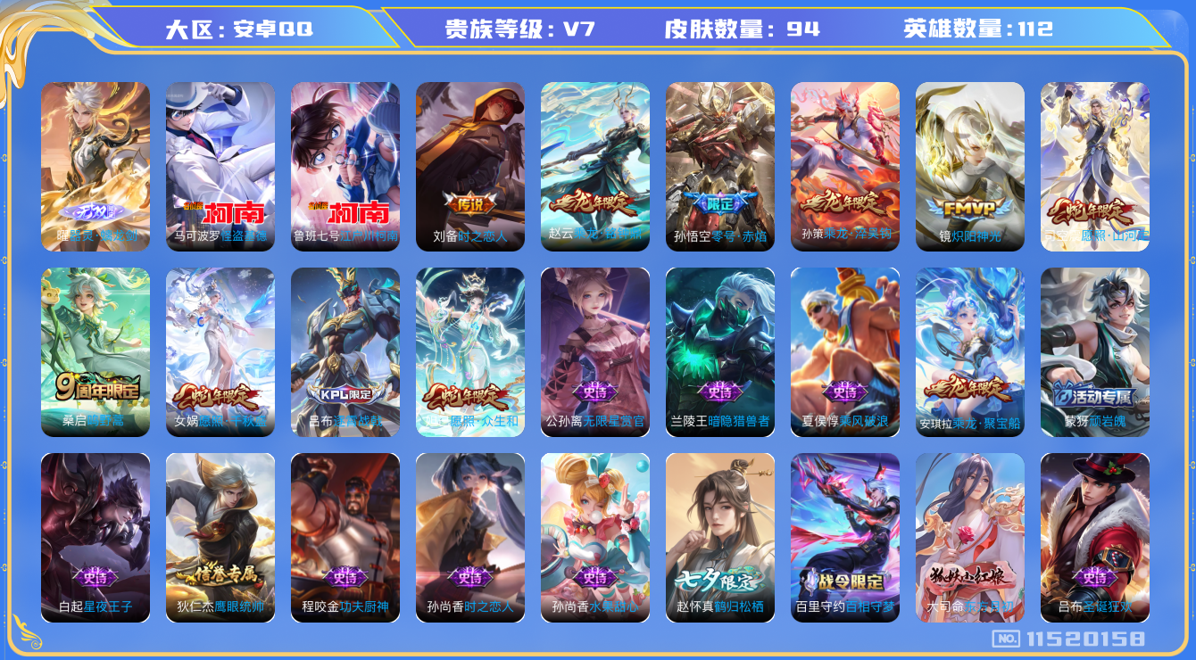 [11520158]V7 1无双 2珍品传说 9传说 112英雄 94皮肤 可修改实名 优质装备:器灵·螭龙剑,江户川柯南,怪盗基德,炽阳神光,零号·赤焰,时之恋人-刘备(电焊工) 传说皮:乘龙·铭钟鼎(赵云年限),乘龙·淬吴钩(孙策年限) 限定皮:愿照·山河定(司空震年限),愿照·众生和(妲己年限),愿照·千秋盛(女娲年限),逐霄战戟,鸣野蒿 史诗皮:战舞者,东方月初,蒙犽顽岩魄,埋骨钱,乘龙·聚宝船(安琪拉年限),百相守梦-百里守约,紫霞仙子,鹤归松栖(赵怀真),无限星赏官,末日机甲-吕布,时之恋人-孙尚香,水果甜心,绅士熊喵,天才门将,星夜王子,功夫厨神,暗隐猎兽者,舞动绿茵,乘风破浪,圣诞狂欢,鹰眼统帅,魅力维加斯,滕王阁序