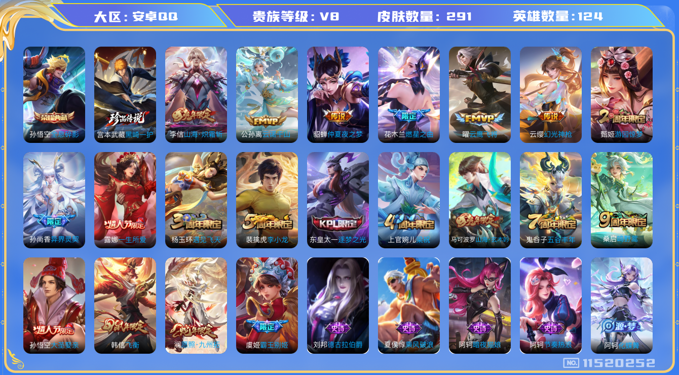 [11520252]V8 1典藏 1珍品传说 10传说 124英雄 291皮肤 可修改实名 优质装备:全息碎影(猴子典藏),黑崎一护,云鹰飞将(小将军),仲夏夜之梦(大飞蛾),山海·炽霜斩(李信年限),燃星之曲 传说皮:云诺千山,幻光神枪 珍宝阁皮:女武神,玩趣恶龙 限定皮:愿照·九州拓(澜年限),鸣野蒿,异界灵契(白毛香),飞衡(韩信年限),遇见飞天,五谷丰年,游园惊梦,梁祝,李小龙,逐梦之光,霸王别姬-虞姬,一生所爱,大圣娶亲,山海·玄木吟(马可年限) 史诗皮:鸭鸭历险记-刘禅,化蝶舞,龙之律动,石田雨龙,百相守梦-黄忠,黄金分割率,特工魅影,千年之狐,江河有灵,偶像歌手,暗夜猫娘,魅语,晚萤,末日机甲-吕布,猫狗日记-孙策,时之恋人-孙尚香,乱世虎臣,节奏热浪,女仆咖啡,摇滚巨星,水果甜心,绅士熊喵,天才门将,星夜王子,功夫厨神,德古拉伯爵,幽灵船长,鬼剑武藏,心灵战警,天秀·启明,舞动绿茵,地狱岩魂,纤云弄巧,繁星吟游(呼啦呼啦),拒霜思,缤纷独角兽,乘风破浪,逐浪之夏,水晶猎龙者,曙光守护者,箭羽风息,金属风暴,原初追逐者,圣诞狂欢,圣诞恋歌,鹰眼统帅,魅力维加斯,未来纪元-赵云