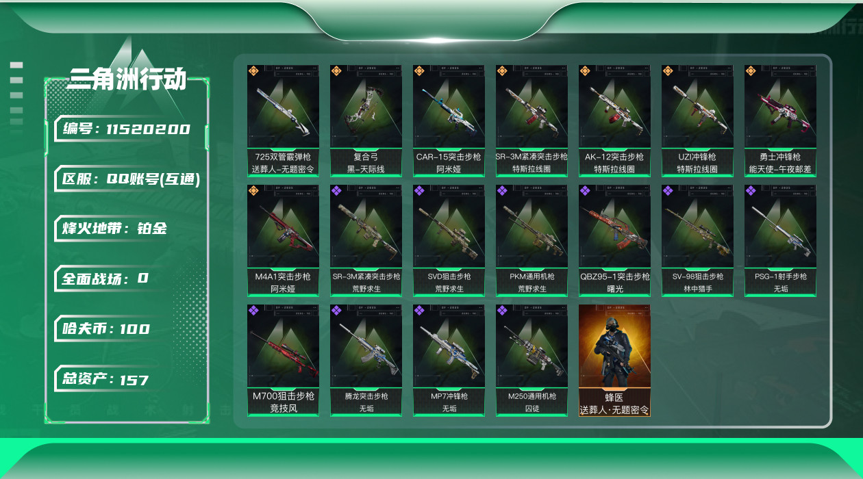 [11520200]总资产:157.1M 1干员外观 8传说枪械 哈夫币:100K 高级安全箱(2×3)9.15号到期 可二次 可修改实名 烽火地带段位:铂金 全面战场段位:无段位 传说武器皮肤:M4A1突击步枪-阿米娅,CAR-15突击步枪-阿米娅,复合弓-黑-天际线,AK-12突击步枪-特斯拉线圈,SR-3M紧凑突击步枪-特斯拉线圈,UZI冲锋枪-特斯拉线圈,勇士冲锋枪-能天使-午夜邮差,725双管霰弹枪-送葬人-无题密令 史诗武器皮肤:PKM通用机枪-荒野求生,SR-3M紧凑突击步枪-荒野求生,SV-98狙击步枪-林中猎手,SVD狙击步枪-荒野求生,M250通用机枪-囚徒,腾龙突击步枪-无垢,MP7冲锋枪-无垢,PSG-1射手步枪-无垢,QBZ95-1突击步枪-曙光,M700狙击步枪-竞技风 干员外观:蜂医-送葬人·无题密令(S5)
