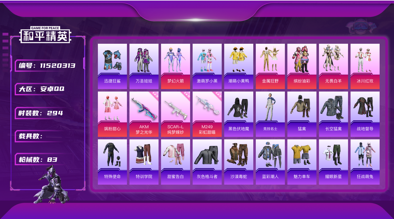 [11520313]6粉装 3特效枪 6印记 可二次 可修改实名 优质装备:梦幻火箭(新101)(新火箭少女101粉色套装),金属狂野,缤纷油彩(猪妹猪脸妹),AKM梦之光华,M249彩虹甜喵(M249-彩虹甜喵),SCAR-L纯梦嫁纱 热门装扮:冰川红玫,飒粉甜心,无畏白羊,激萌罗小黑,潮萌小黄鸭,迅捷狂鲨,万圣娃娃 五级特效枪:五级SCAR-L-纯梦嫁纱,五级AKM-梦之光华,五级M249-彩虹甜喵 紫色装扮:SS22特训,妙红点点,灵蜜圈圈,幻彩翩翩,SS23特训,酸甜橘柚,灵动马戏师,娇憨猪猪,萌趣咩咩,SS21特训,熠彩粉晶,苍岚星,军械专家,SS5特训,冰川特警,青涩时光,青春冒险家,长空猛禽,野性战心,金鼠迎春,雪山精英,霓虹街区,荧惑魅影,缤纷果语,耀眼新星,荣耀,蓝彩潮人,龙的传人,飞行日记,魅力单车,鹤鸣,麻辣教官,黑色伏地魔,龟仙人,极地朋克,柠萌假日,沙漠毒蛇,涂山之恋,夏日倾情,战地督导,疯狂小兔子,王牌教练,空岛之星,甜蜜告白,猛禽,灰色格斗者,牛气冲天,牛气满满,特殊使命,特训学院,狂战萌兔,玉兔迎春,竞技名士,惊鸿侠骨,SS25特训,2B战斗服款,甜梦熊熊,神气柴柴,懵萌河马,SS24特训(SS24特训套装),萤火魅影(套装-荧惑魅影),锦衣飞扬,元气发射,SS27特训,金羽特工,华灯初上,SS26特训,隐空刺,纯白誓言,青玉碎影,绯格组合,萌黄之夏,光之冒险 优质战备:超新星飞行器,彩虹甜喵降落伞,圣光天使降落伞,未来歌姬降落伞,飒粉甜心降落伞,梦幻火箭降落伞,甜蜜誓约降落伞