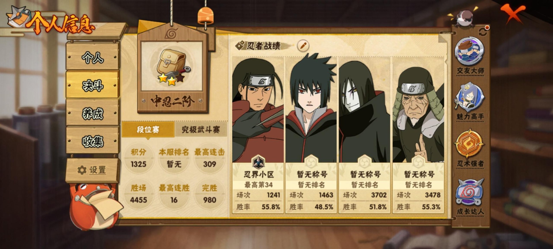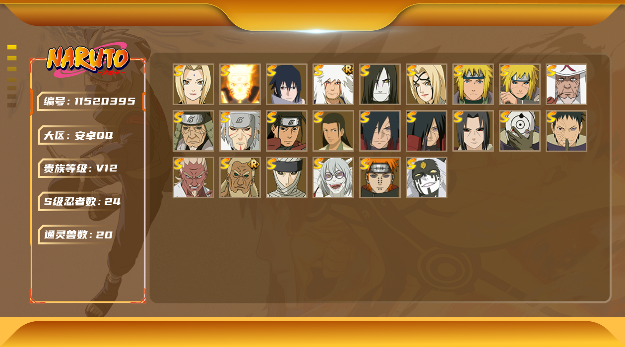 [11520395]V12 24S忍 52A忍 20通灵 1367W战力 可二次 可修改实名 优质装备:熊猫,宇智波鼬「秽土转生」,药师兜「仙人模式」,宇智波斑「秽土转生」,艾「三代目雷影」,千手扉间「秽土转生」,纲手「百豪」,无「二代目土影」,波风水门「秽土转生」,猿飞日斩「秽土转生」,千手柱间,宇智波带土 「忍界大战」,“宇智波斑” 「白面具」,漩涡鸣人 「九喇嘛连结」,宇智波佐助「永恒万花筒」,千手柱间·木叶创立,宇智波斑「秽土转生·解」,大筒木桃式,艾「忍界大战」 S级忍者:自来也 「舞之豪杰」,佩恩「天道」,猿飞日斩,波风水门,大蛇丸,纲手