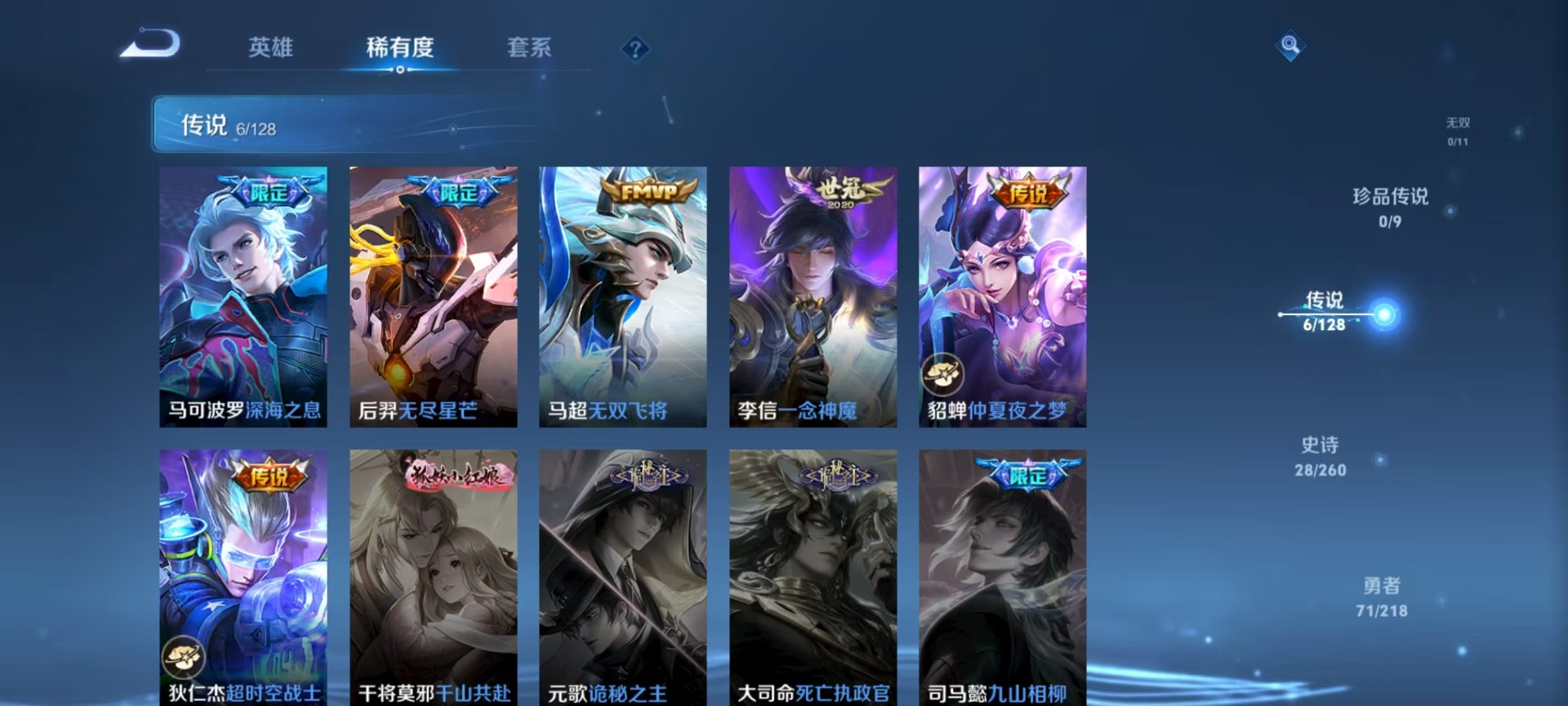 - PX_2086735-66 苹果QQ/最强王者/223皮肤/125英雄/1典藏/0珍品无双/1无双/3珍品传说/20传说/53史诗/9稀有英雄 【3 珍品传说】怪盗基德 马可波罗,器灵·落星盏 嫦娥,江户川柯南 鲁班七号, 【1 典藏皮肤】弑枪猎影 韩信, 【1 无双皮肤】器灵·螭龙剑 曜, 【20 传说皮肤】启明星使 虞姬,逐花归海 澜,零号·赤焰 孙悟空,凤求凰 李白,浮生妄 夏洛特,地狱之眼