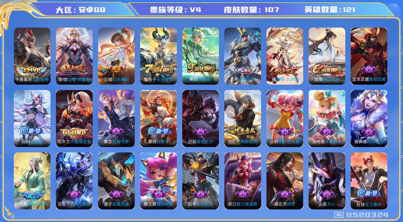 [11520324]V4 5传说 121英雄 107皮肤 可修改实名 优质装备:久胜战神,山海·炽霜斩(李信年限) 传说皮:幻光神枪 珍宝阁皮:蔷薇恋人,玩趣恶龙 限定皮:愿照·九州拓(澜年限),逐霄战戟,鸣野蒿,高山流水,五谷丰年 史诗皮:器灵·浮梦炉,化蝶舞,龙之律动,百相守梦-黄忠,特工魅影,百解令(蒙犽),冰冠公主,末日机甲-吕布,修罗,水果甜心,星夜王子,鬼剑武藏,舞动绿茵,缤纷独角兽,水晶猎龙者,金属风暴,鹰眼统帅,魅力维加斯,无心