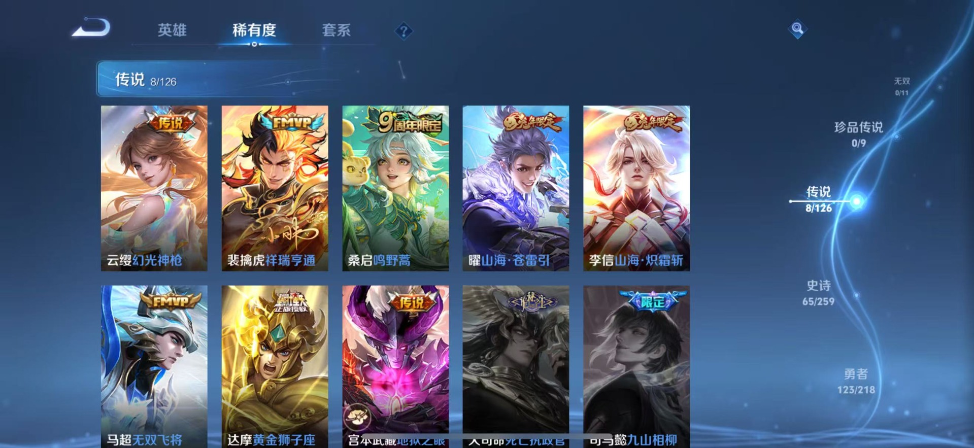 - [12295013]V8 1典藏 1珍品传说 17传说 125英雄 304皮肤 可修改实名 优质装备:全息碎影(猴子典藏),朽木白哉,炽阳神光,一念神魔,地狱火,音你心动-小乔,零号·赤焰,游龙清影(小青龙),淬星耀世,妄想实况,澜逐花归海,琥珀纪元铠,琥珀纪元马超 珍宝阁皮:妄想食味,优雅恋人 限定皮:逐霄战戟,鸣野蒿,至尊宝,白虎志(电光耗子),太华(伽罗年限),时雨天司(水龙头),飞衡(韩信年限),五谷丰年,冰锋战神,游园惊梦,梁祝,天狼狩猎者,逐梦之星,天狼溯光者,天狼绘梦者,李小龙,逐梦之影,辉光之辰,如梦令-嫦娥,如梦令-后羿,孙行者,大圣娶亲,天魔缭乱,匿光追影者 史诗皮:星界战将,龙之律动,石田雨龙,琥珀纪元伽罗,蔬乡物语(鲁班七号),百相守梦-黄忠,苍穹之光,电玩小子(小书包),白龙吟,黄金分割率,特工魅影,千年之狐,江河有灵,雪夜绮愿(周瑜),百解令(蒙犽),高渐离燃音魔法,偶像歌手,暗夜猫娘,末日机甲-吕布,猫狗日记-孙策,乱世虎臣,节奏热浪,修罗,女仆咖啡,摇滚巨星,水果甜心,绅士熊喵,天才门将,星夜王子,心灵骇客,德古拉伯爵,暗隐猎兽者,幽灵船长,鬼剑武藏,心灵战警,舞动绿茵,地狱岩魂,纤云弄巧,繁星吟游(呼啦呼啦),拒霜思,缤纷独角兽,乘风破浪,逐浪之夏,龙鼓争鸣,水晶猎龙者,曙光守护者,箭羽风息,金属风暴,圣诞狂欢,圣诞恋歌,鹰眼统帅,魅力维加斯,黎明之约,未来纪元-赵云